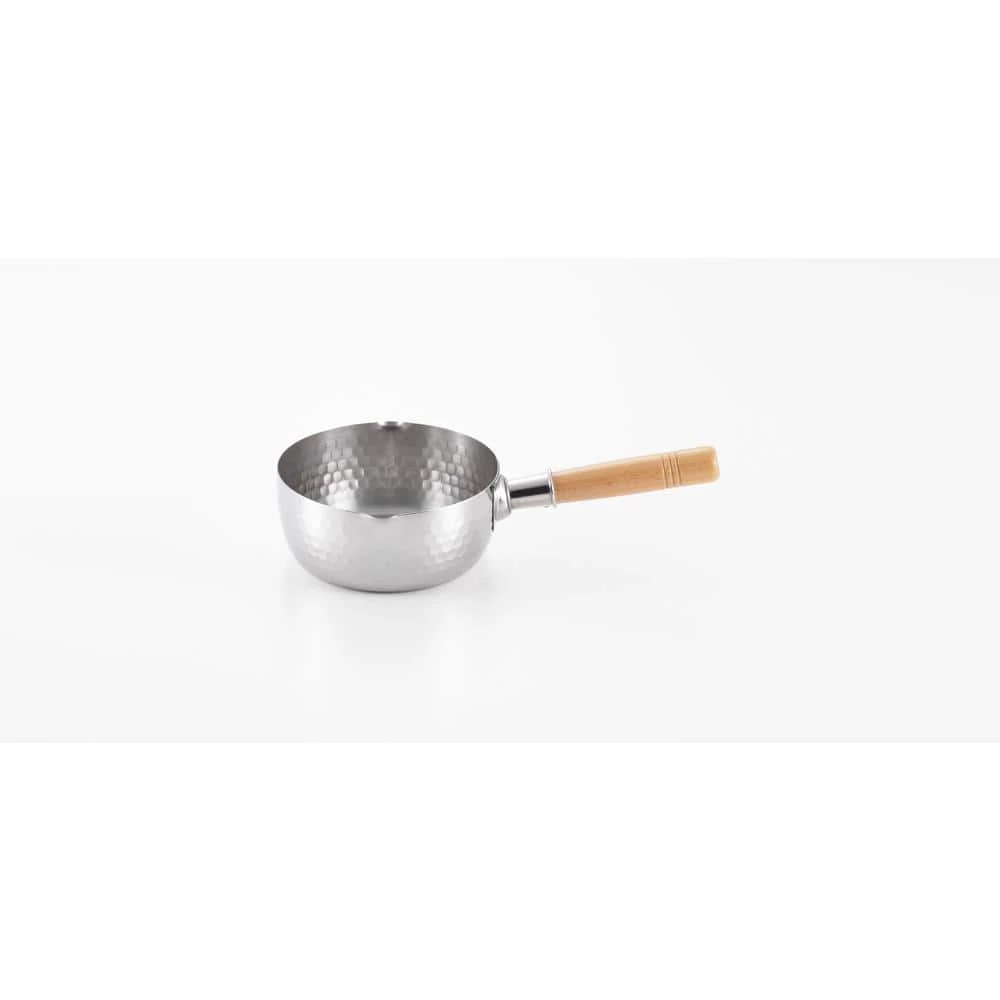 1.2 qt. Traditional Japanese Yukihira Pot perfect for making noodles, soups, and broths. Light weight, thin walled hammered stainless steel with comfortable beechwood handle. Pouring Spouts on both sides. Lid sold separately.