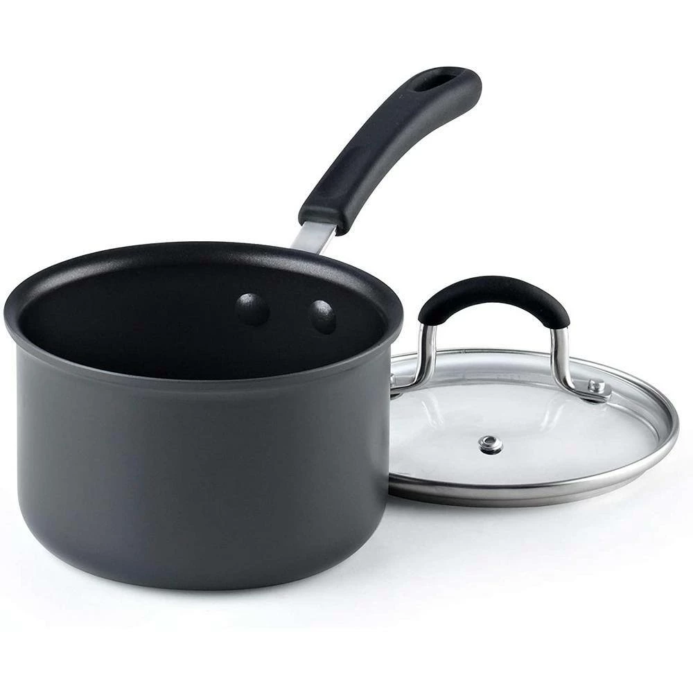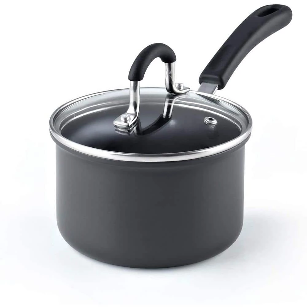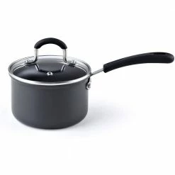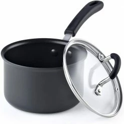 The Cook N Home 1. 5 qt./18cm anodized nonstick saucepan has a hard anodized surface that is durable, heats evenly/quickly, and prevents hot spots. Material is harder than steel, thick, and chip-resistant. Nonstick delivers exceptional performance, makes cleaning/food release easy, and allows for healthy cooking. Tempered glass lids with steam vent makes viewing food easy, keeps heat/moisture in, and fits on fry pans. Riveted comfortable handles with wide grip Stay cool while cooking and has a hole for hanging. Utensils with guard are sturdy for mixing, moving, and transferring foods. Not induction compatible. Works on gas, electric, glass, ceramic, halogen, etc. Oven safe to 350F. Dishwasher safe, hand wash recommended.