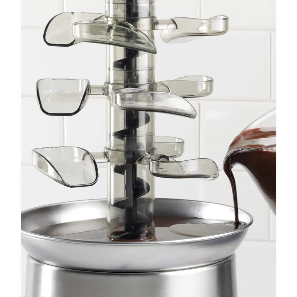 Bring any party or event to life with a very unique fondue design that creates a delectable cascade of mouth-watering goodness. Unlike traditional fondue, this unit allows delicious dipping sauces to flow from tier to tier, creating a flow of chocolate, barbecue sauce, ranch dressing, nacho cheese, buffalo sauce and more! Watch as the dipping sauce is carried to the top of the tower where it flows down each tier in a mesmerizing display. Provide guests with fresh strawberries, marshmallows, pretzels, cookies, chicken wings, vegetables and other goodies for dipping. Easily disassembles for quick cleanup. The fountain is a beautiful addition to any dining table or casual gatherings with friends and family.