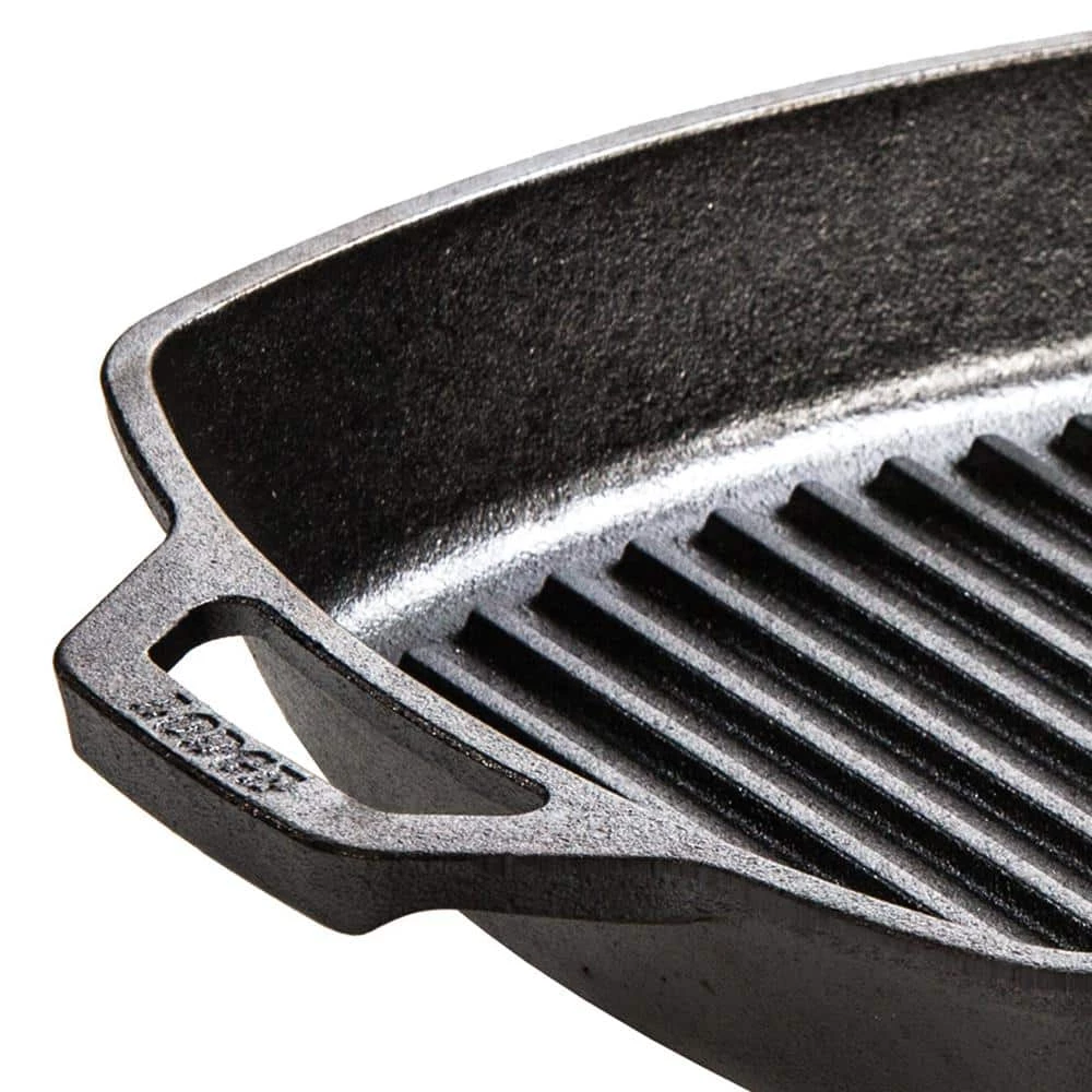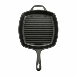 Seasoned 10.5 in. Square Cast Iron Grill Pan with assist handle. The ribs of the Lodge square grill pan allows fats to drain from foods while also searing tantalizing grill marks onto meats and vegetables. The griddle is at home in the oven, on the stove, on the grill or over the camp fire. Get mouth-watering grill marks and fantastic seared flavor at home. Grill and serve directly to the table with one magical pan. Crafted in America with iron and oil, its naturally seasoned cooking surface is ready to help you create tasty moments. Seasoned and ready to use.