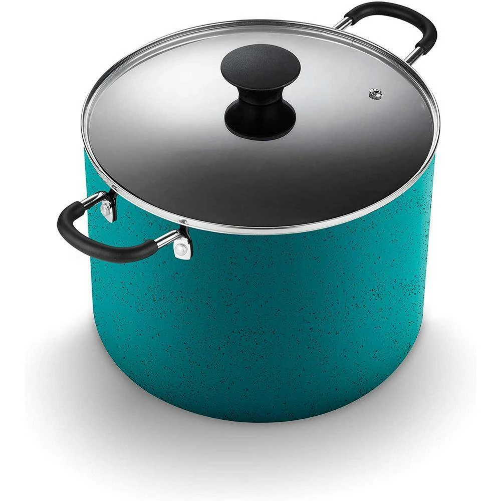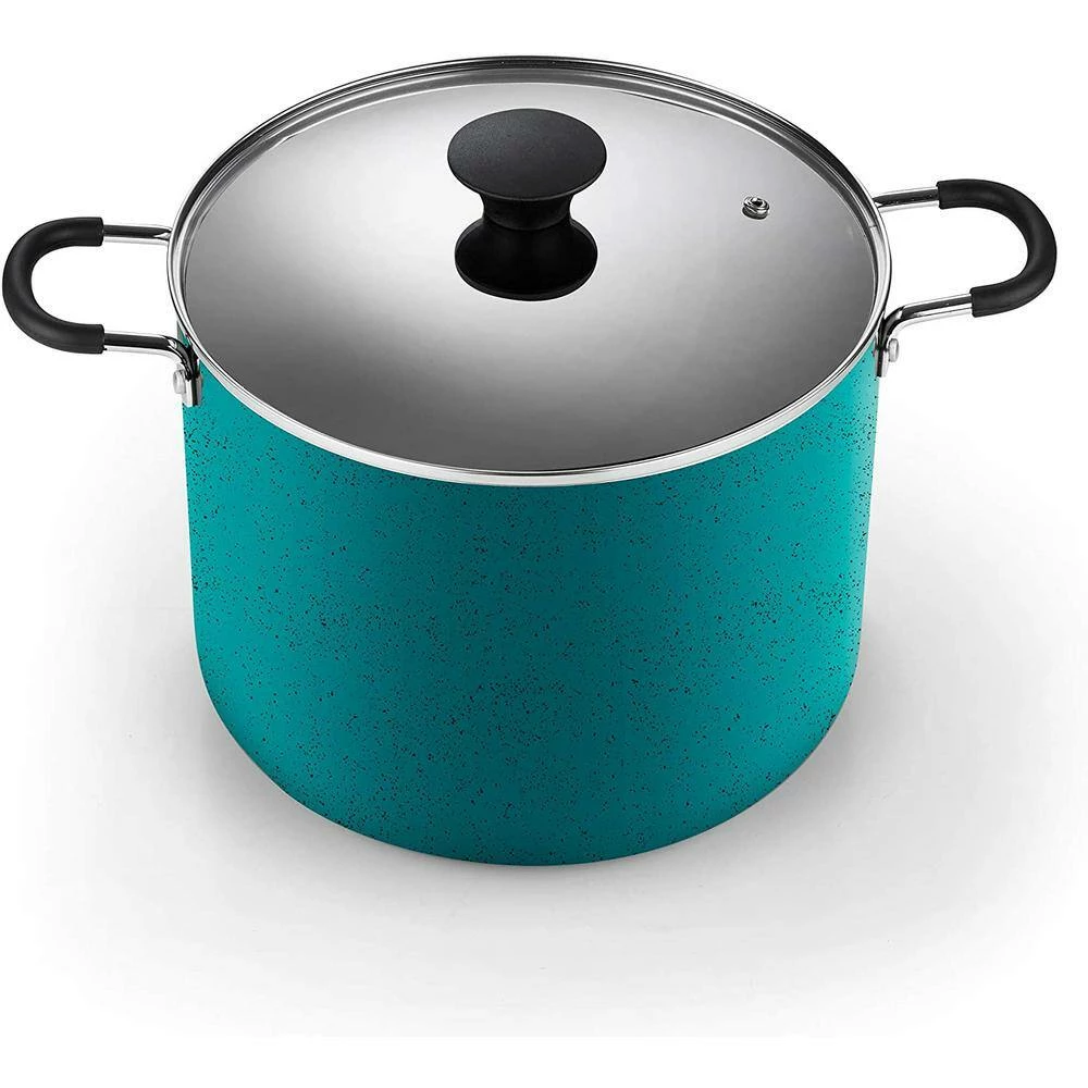 The Cook N Home 10. 5 quart nonstick stockpot with lid is made of thick gauge aluminum that provides even heat conduction and prevents hot spots. Nonstick coating Black interior makes food release and cleaning easy. Pfoa, cadmium, and lead-free. Stay-cool handles are comfortable and are riveted for strength and durability. Tempered glass lid with steam vent makes viewing food easy from start to finish. Induction compatible. Works on gas, electric, glass, halogen, etc. Oven safe to 350F. Dishwasher safe.