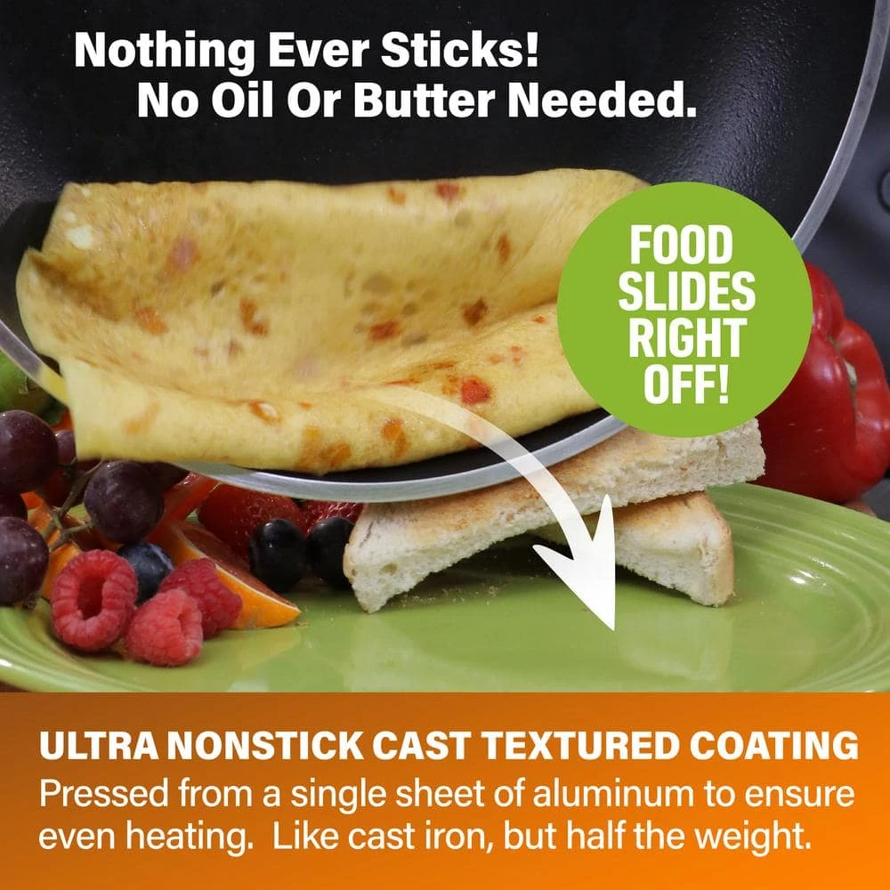 - ULTRA NONSTICK – the nonstick cooking surface is coated three times and reinforced with diamonds to deliver the ultimate food release. No oil or butter needed makes for healthier eating, and provides for hassle free, 1-2-3 cleanup.