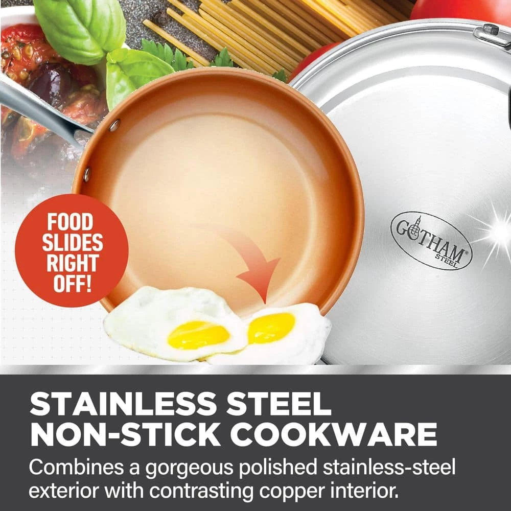 With a Triply reinforced stainless-steel exterior and a Ti-Cerama interior, this is one of the most powerful frying pans form Gotham Steel. The fry pan has a high shine stainless steel chrome exterior that will elevate your kitchen. Non-stick, non-scratch (metal utensil safe), oven safe up to 500°, flame-proof. Induction compatible About the Product Gotham Steel is the first product of its class to actually utilize high-grade titanium and ceramic as surface finishing. This sophisticated combination not only ensures maximal durability it also allows for multi-fictional, all-around usage. Titanium plus Ceramic Coating FAQs High-heat threshold to sear perfectly browned steaks. Everything just slides right off, even burnt chocolate and cheese. Food flavor is not altered when cooking tomato-based or any acidic food products thanks to the ceramic component. The non-stick surface cleans easy. Versatile: for stove-top cooking, or baking. Rust-proof all over. Coating doesn’t peel off with constant usage and washing.