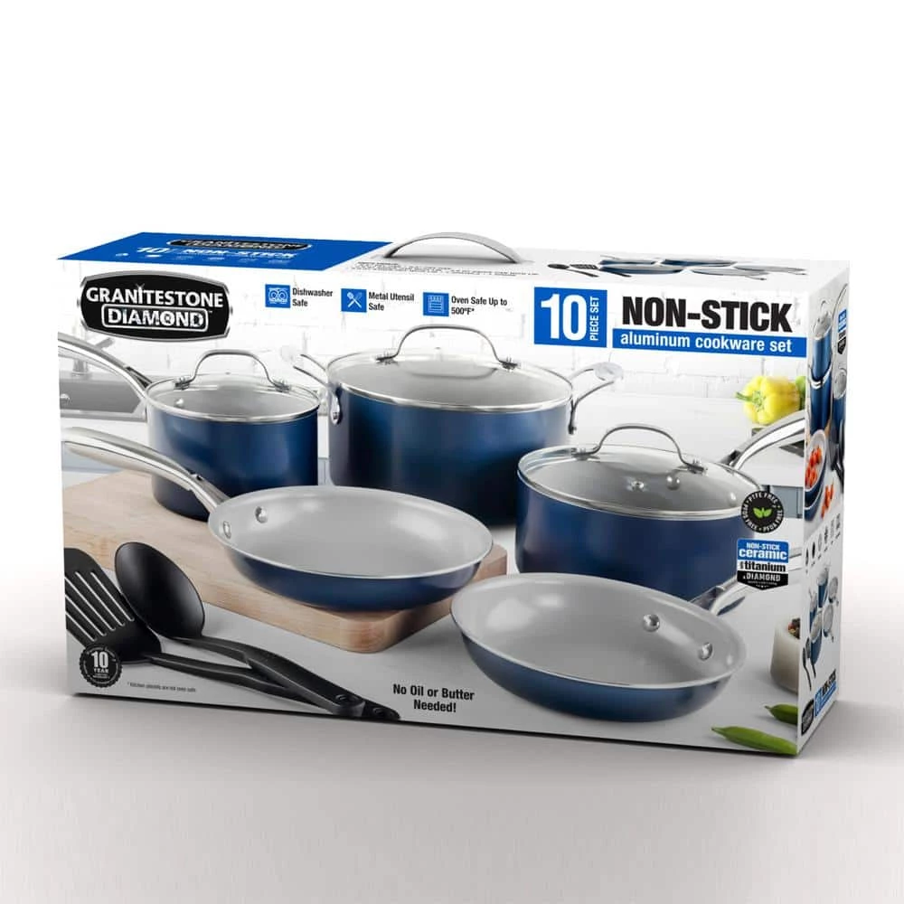 Creating culinary magic is easier with this performance set from Granite Stone Diamond. The cookware is in durable aluminum with a tough-as-nails diamond-reinforced nonstick coating. The pots and pans are oven safe for added versatility. Granitestone nonstick cooking surface is coated three times and then reinforced with diamonds to deliver the ultimate food release.