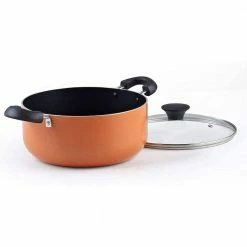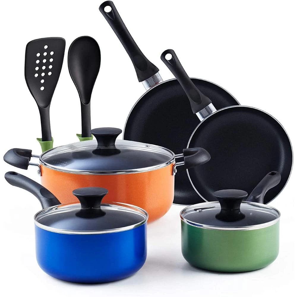 The Cook N Home 10-Piece Nonstick Stay Cool Handle Cookware Set, Multicolor includes: 1 and 2 qt. saucepans with lids, 5 qt. dutch oven with lid, 8 and 9.5 in. fry pans, nylon spatula, and nylon spoon. The cookware is made of thick gauge aluminum that provides even/quick heat conduction and prevents hot spots. Nonstick makes food release/cleaning easy and allows for healthy cooking. Riveted comfortable handles stay cool while cooking and has a hole for hanging. Tempered glass lids with steam vent makes viewing food easy, keeps heat/moisture in, and fits on fry pans. Utensils with guard are durable for mixing, moving, and transferring foods. Not Induction compatible. Works on gas, electric, glass, ceramic, halogen, etc. Oven safe to 350F. Dishwasher safe.