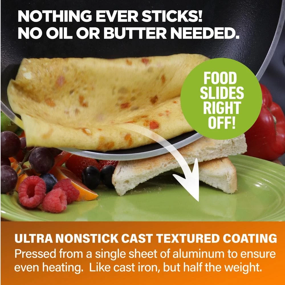 - ULTRA NONSTICK – the nonstick cooking surface is coated three times and reinforced with diamonds to deliver the ultimate food release. No oil or butter needed makes for healthier eating, and provides for hassle free, 1-2-3 cleanup.