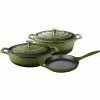 - Cookware set constructed from hard-anodized aluminum with a medium gauge thickness that is resistant to denting, corrosion, and warping