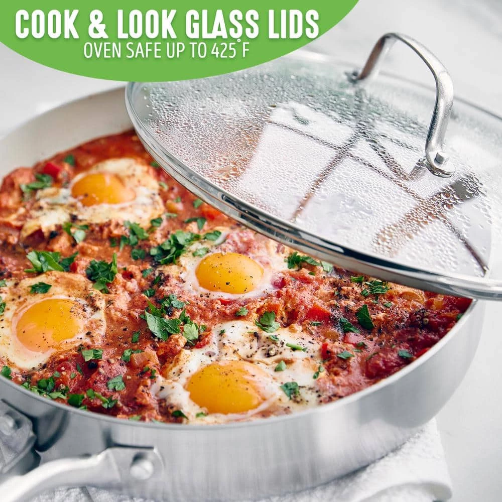 We’re breaking new ground with this 3-ply stainless steel collection. Featuring two layers of stainless steel surround an aluminum core, this collection heats quickly, evenly, and performs as good as it looks. And it’s finished with our toxin-free ceramic nonstick coating, so everything you make will be a little healthier, too. That’s because our ceramic nonstick is not stuck in the past-our ceramic nonstick starts with sand and creates 60% fewer CO2 emissions during the curing phase than traditional coatings.