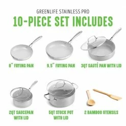 - Set includes: 8 in. and 9.5 in. frypans, 3 qt. saute pan with lid, 2 qt. saucepan with lid, 5 qt. stockpot with lid, bamboo solid spoon, bamboo solid turner