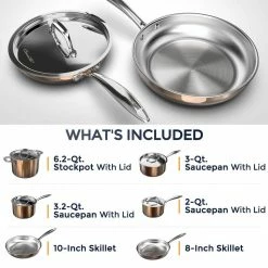 - 2-quart saucepan with lid, 3-quart saucepan with lid, 3.2-quart saucepan with lid, 6.2-quart stockpot with lid, 8-inch skillet, 10-inch skillet
