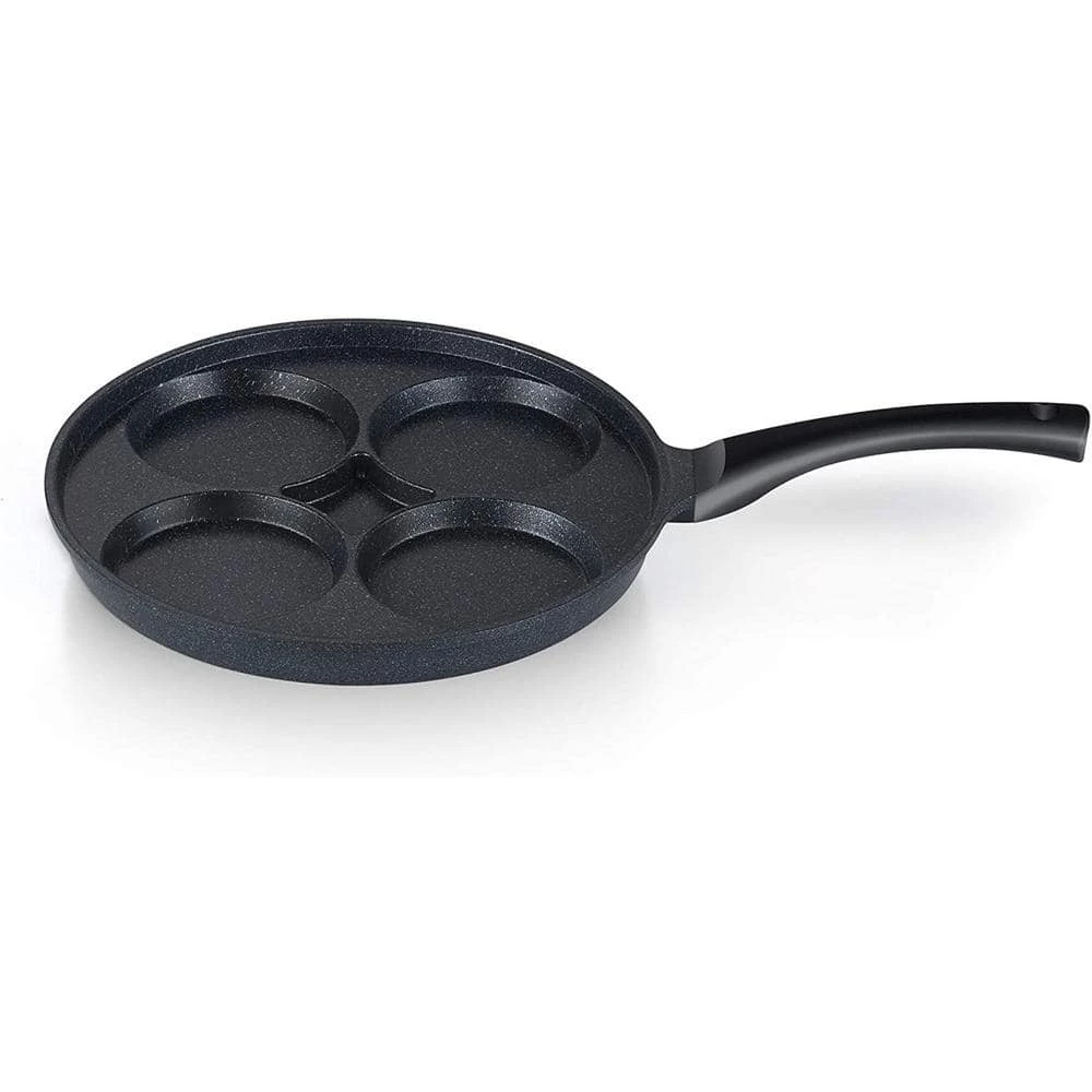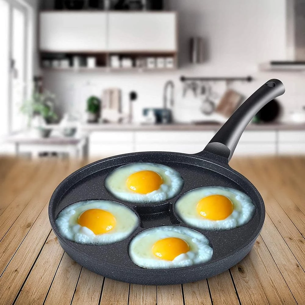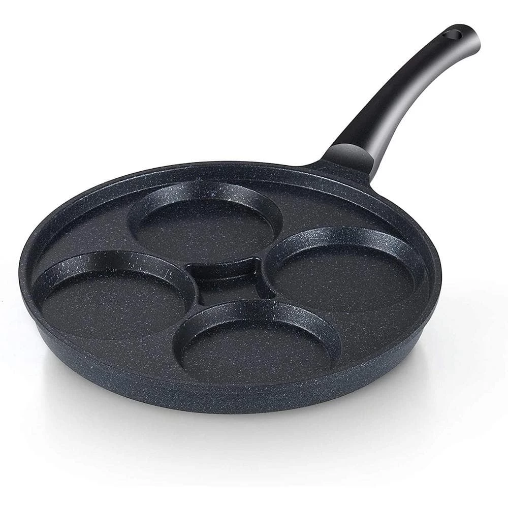 The Cook N Home Nonstick Marble coating 4 egg fry pan is made of fine grade aluminum that provides even heat conduction and prevents hot spots. Nonstick marble coating makes food release/cleaning easy and allows for healthy cooking. Die-cast aluminum is break resistant and does not warp. Lightweight for tossing and flipping foods. Handle stays cool and comfortable while cooking also has a hole for hanging. Works on gas, electric, glass, ceramic, halogen, etc. Not Induction compatible and not oven safe. Dishwasher safe, hand wash recommended for longer life span. Do not use with metal utensils.