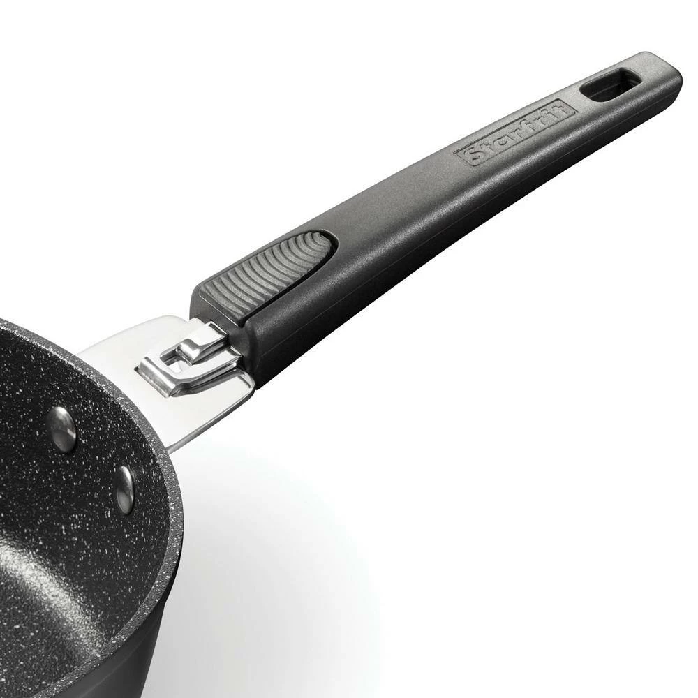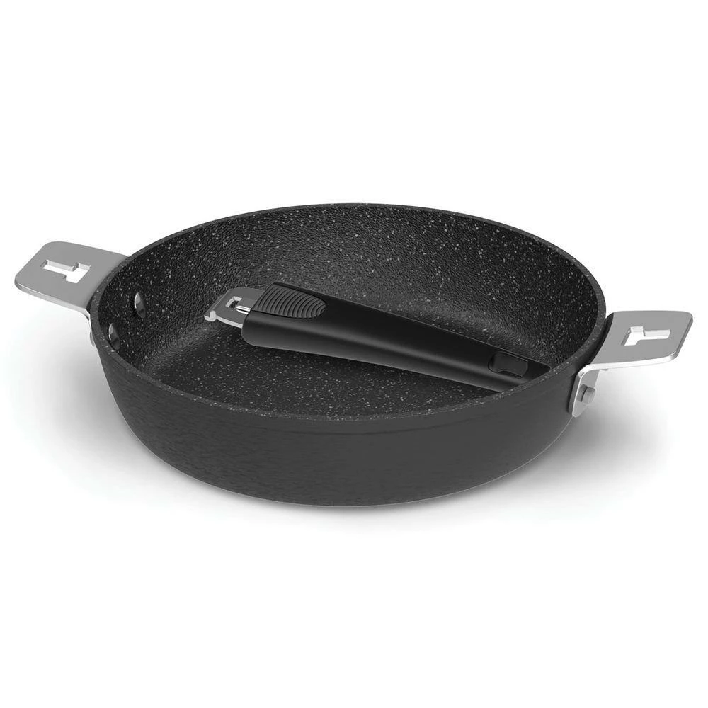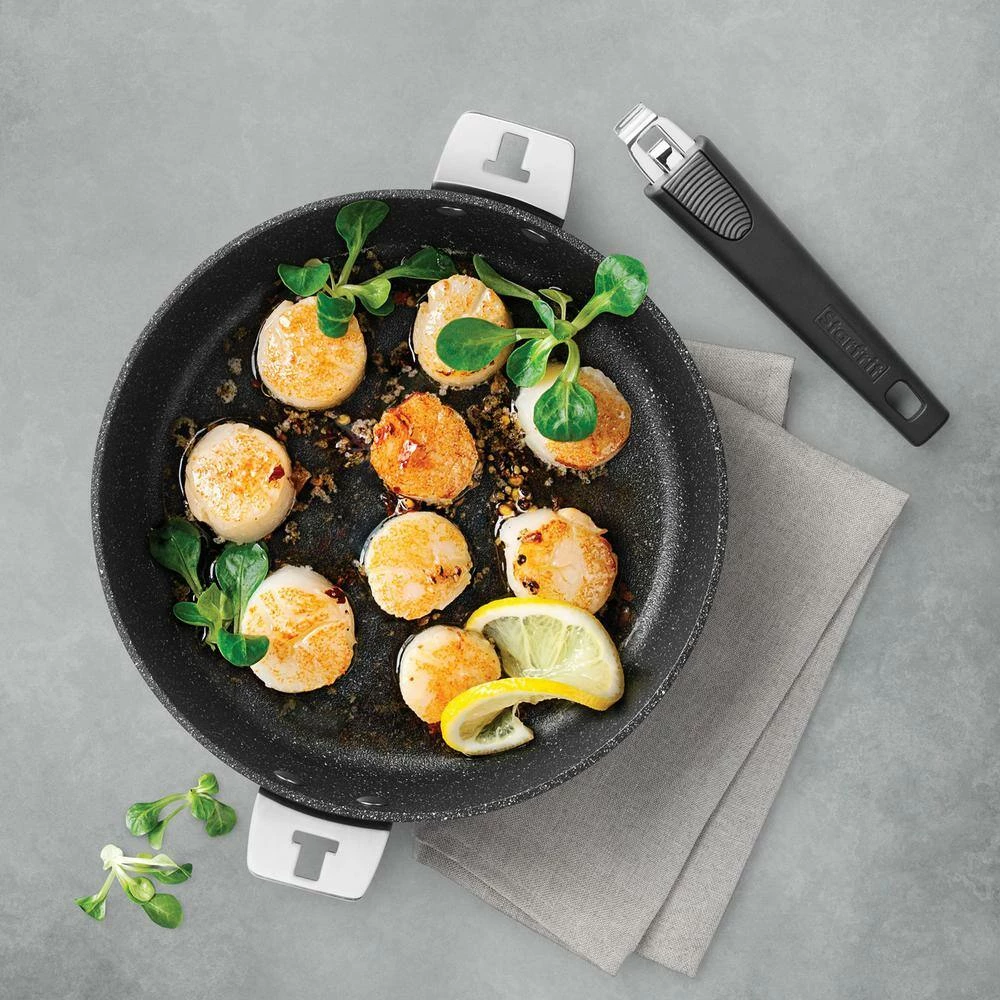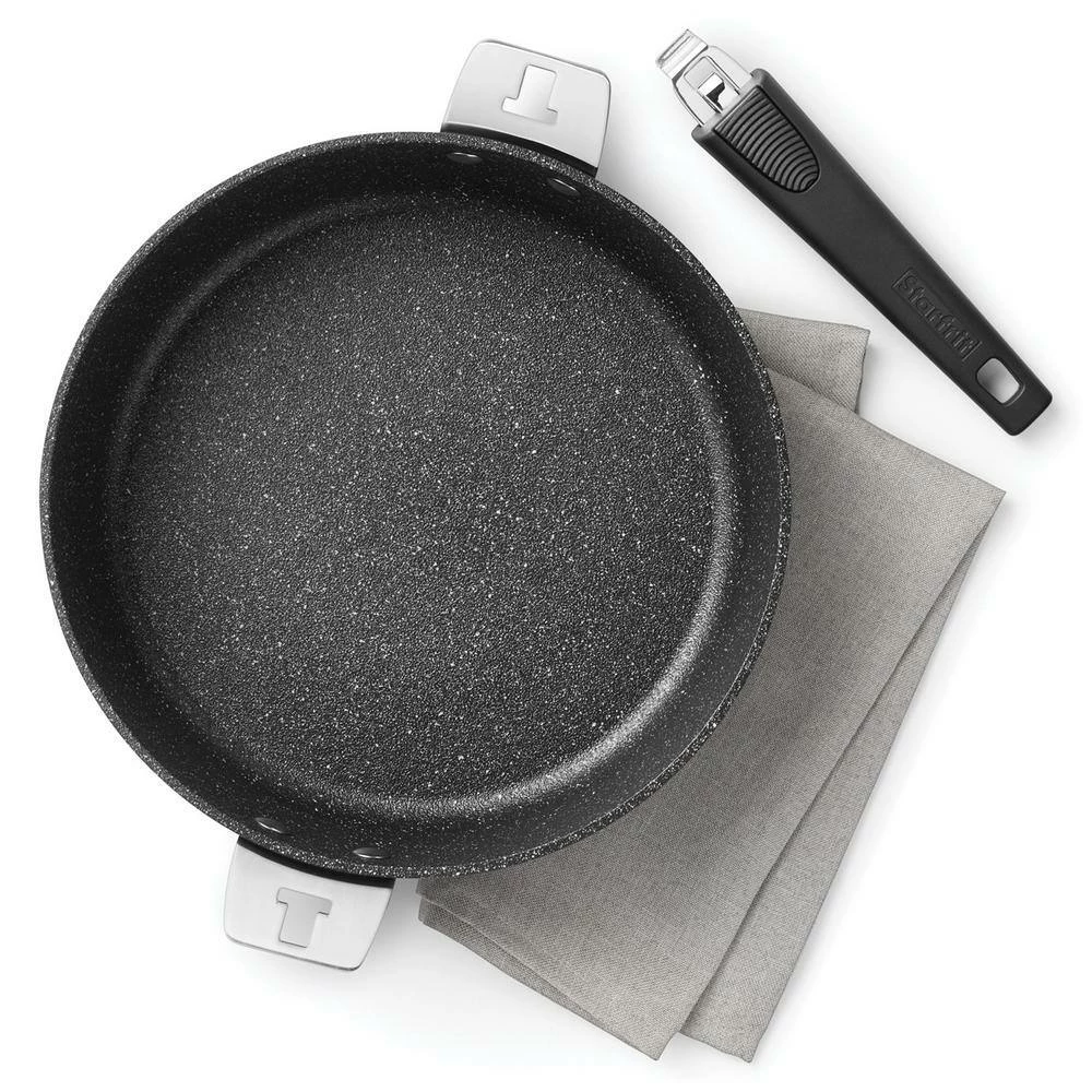 THE ROCK by Starfrit 11 in. Fry Pan/Round Dish with T-Lock Detachable Handle will help you save storage space. The T-Lock system means the handle can be removed for storage and reattached once the pan emerges from the oven or dishwasher. And not only does the T-Lock system save up to 40% in storage space by eliminating the awkward handle, it can be used with or without the handle, from cooktop or oven to table. Plus, this pan uses the same surface treatment and nonstick coating that makes THE ROCK so unique.