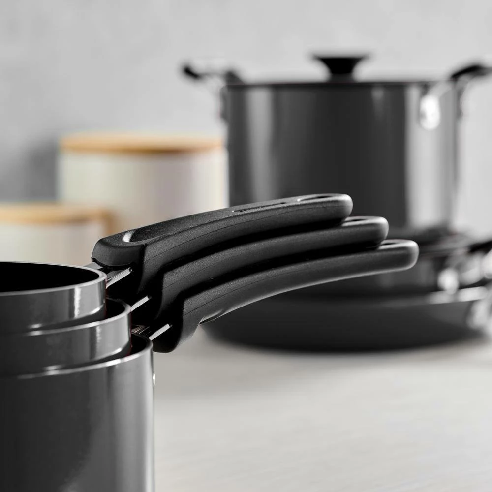 - Durable, easy-to-clean, high-quality cookware that saves up to 50% more storage space