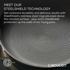 - WHAT IS STEELSHIELD: Circulon SteelShield pots and pans are the first to feature stainless steel circles raised above a premium nonstick finish for the most versatile and durable cookware surface yet. Use any kitchen spoon or spatula on hand to flip, fry, and even scrape the innovative SteelShield rings. On our frying pans, the rings extend up the side walls for even more surface protection. Metal utensils? Bring it on. To prove it, we even included a metal spatula and scraping spoon in the set.
