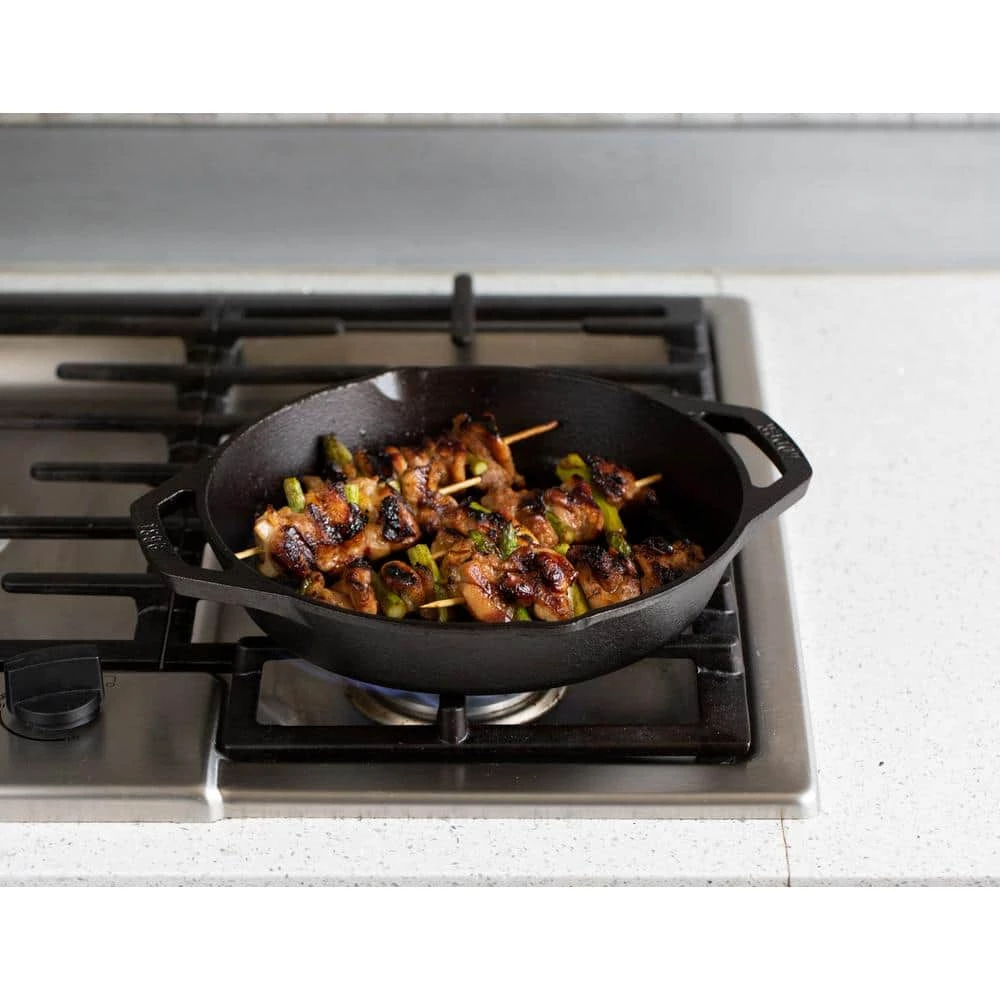 Add grill marks to your favorite foods while the pan’s ribbed bottom keeps grease off your dish for healthy cooking. The dual handles provide great lift and control. Made for decades of cooking.