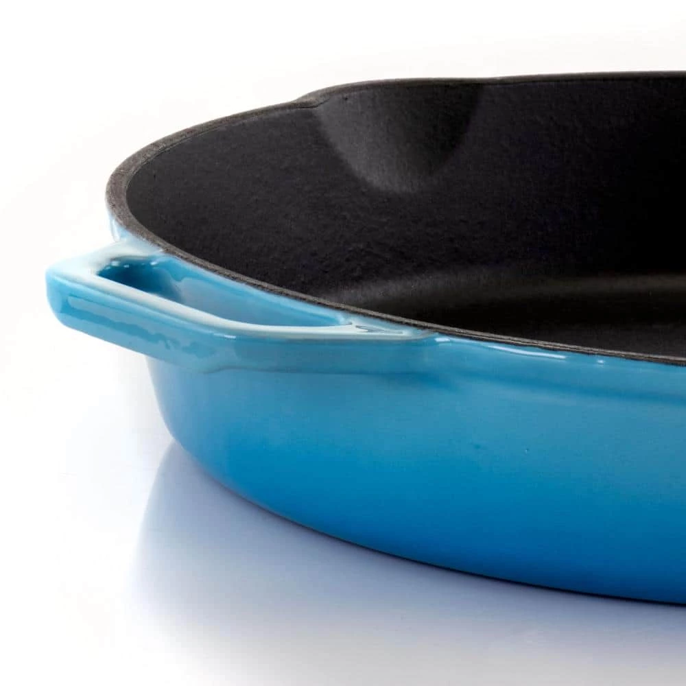 The MegaChef Round 12 in. Enamel Cast Iron Skillet allows any home chef to create their best meals. Made of non-stick enameled cast iron f or healthier meals by allowing cooks to cut down on oils and fats. This col orful frying pan provides the user with 2-pouring spouts to better spread delicious sauces over dishes. The durable cast iron material is guaranteed to last along with the outer enameled coating that protects the cookware from m ore acidic ingredients. The handle conveniently is made with a hanging hole f or easy st orage via hanging hooks. Bring col or to the kitchen with the lovely gradient displayed on the underside of the skillet. Its deep capacity allows f or saucier m orsels like fajitas and Tuscan chicken to fav orites like deep-dish pizza and lamb chops.
