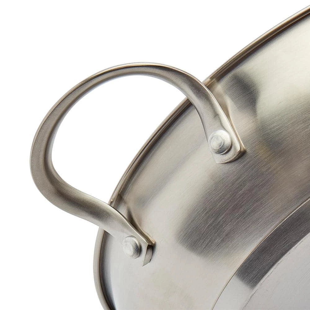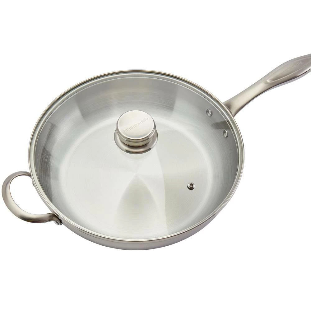Frigidaire Ready Cook 12 in. Fry pan with lid is a great addition to your kitchen. Oven safe to 400F/204 with lid and 450 in./232°C without lid. Our 12 in. fry pan is durable and easy to handle with 2-riveted handles. Brushed stainless steel with a heavy aluminum core ensures fast even heating on gas, glass, electric and induction cooktops.