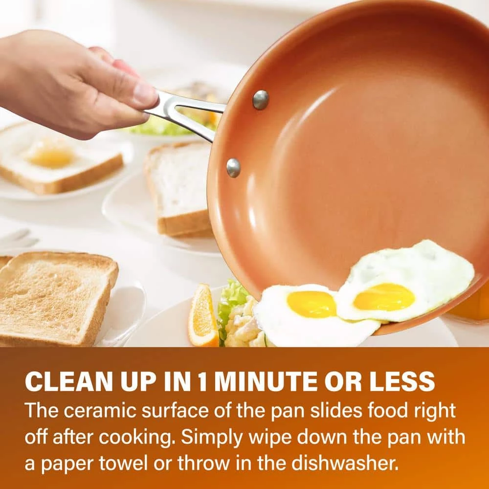 Gotham Steel Cookware Set was designed with a Ti-Ceramic coating that combines super strong titanium fused with super slick ceramic for the perfect balance of nonstick and durability. It is PTFE and PFOA free which means nothing will stick. Cook without butter or oil. Gotham Steel will change the way you cook and clean. The Ti-Ceramic coating allow for easy clean up and dishwasher safe.