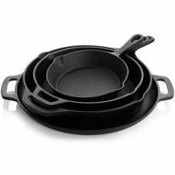 The MegaChef 12-piece preseasoned cast iron cookware set comes with all your cooking essentials, from storage to frying pans. Cast iron construction provides the most even heat distribution for improved cooking, frying, sauteing, baking, grilling, broiling, braising and more. This essential cast iron set comes with three frying pans of varied sizes, one Dutch oven with lid that can be turned over and used as an additional fry pan, 2-silicone grips, 2-scrapers, one silicone handle cover, and one storage organizer. Each-piece comes pre-seasoned to prevent any rust while in storage and for immediate use. The continuous baking-in of oils make for an increasingly non-stick finish will provide extra layers of strength to make this cookware last a lifetime. Silicone mits provide safe handling while pans are hot. Scrapers make cleaning a breeze and can also be used to assist in baking, cooking, or scrubbing. Quality metal rack provides storage options, place right in your cabinet or use to add countertop storage to your kitchen.