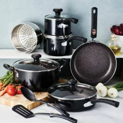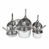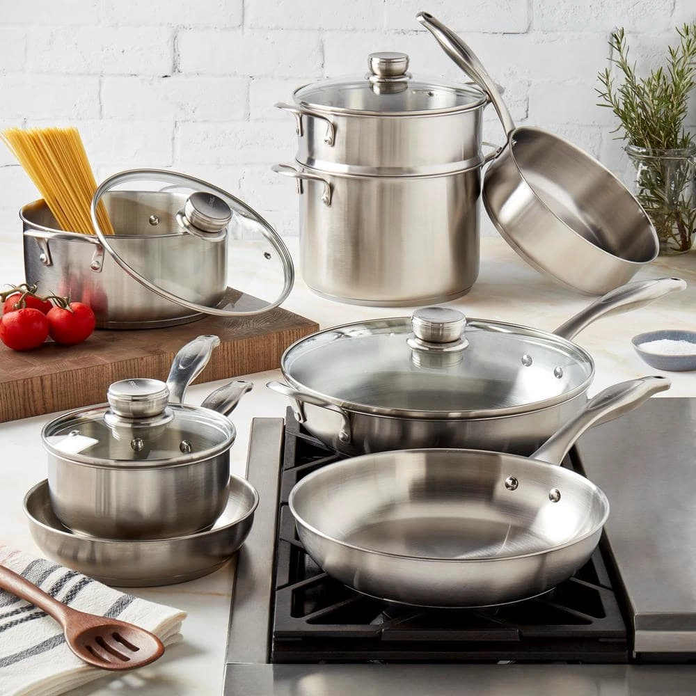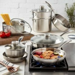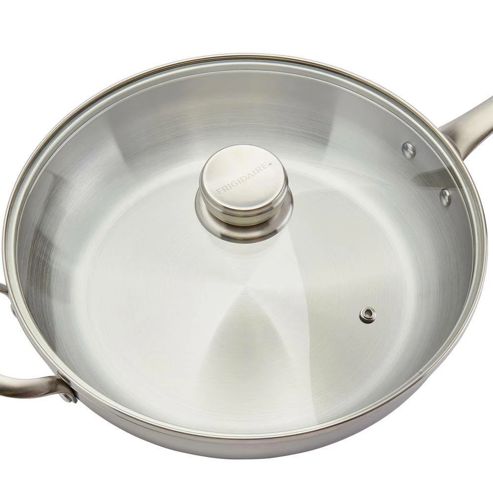 Frigidaire Ready Cook Cookware is the perfect cookware and utensil set to help you prepare delicious meals. Our 12-Piece stainless steel set features a 1.5 qt. sauce pot with lid, 3 qt. saute pan, 5 qt. stock pot with lid, 8 in. fry pan, 10 in. fry pan, 12 in. fry pan with lid and 8 qt. stock pot with steamer and lid. Oven safe to 400°F/204°C with lid and 450°F/232°C without lid. Compatible with all surfaces, Electric, Glass, Gas and Induction cooktops. Dishwasher safe; safe for use with all cooking utensils.