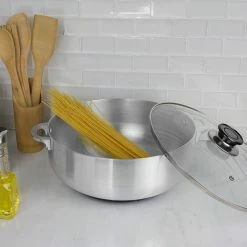 Perfect for cooking a wide range of meals, this caldero is a great essential for cooking meat, rice and other dishes. This heavy duty cooking must-have features an aluminum satin finish for even heat distribution and beautiful presentation. The clear glass lid locks in flavor and provides an easy view of your culinary creation. Rounded handles makes it easy to transfer it from the oven and onto a trivet, or sink.