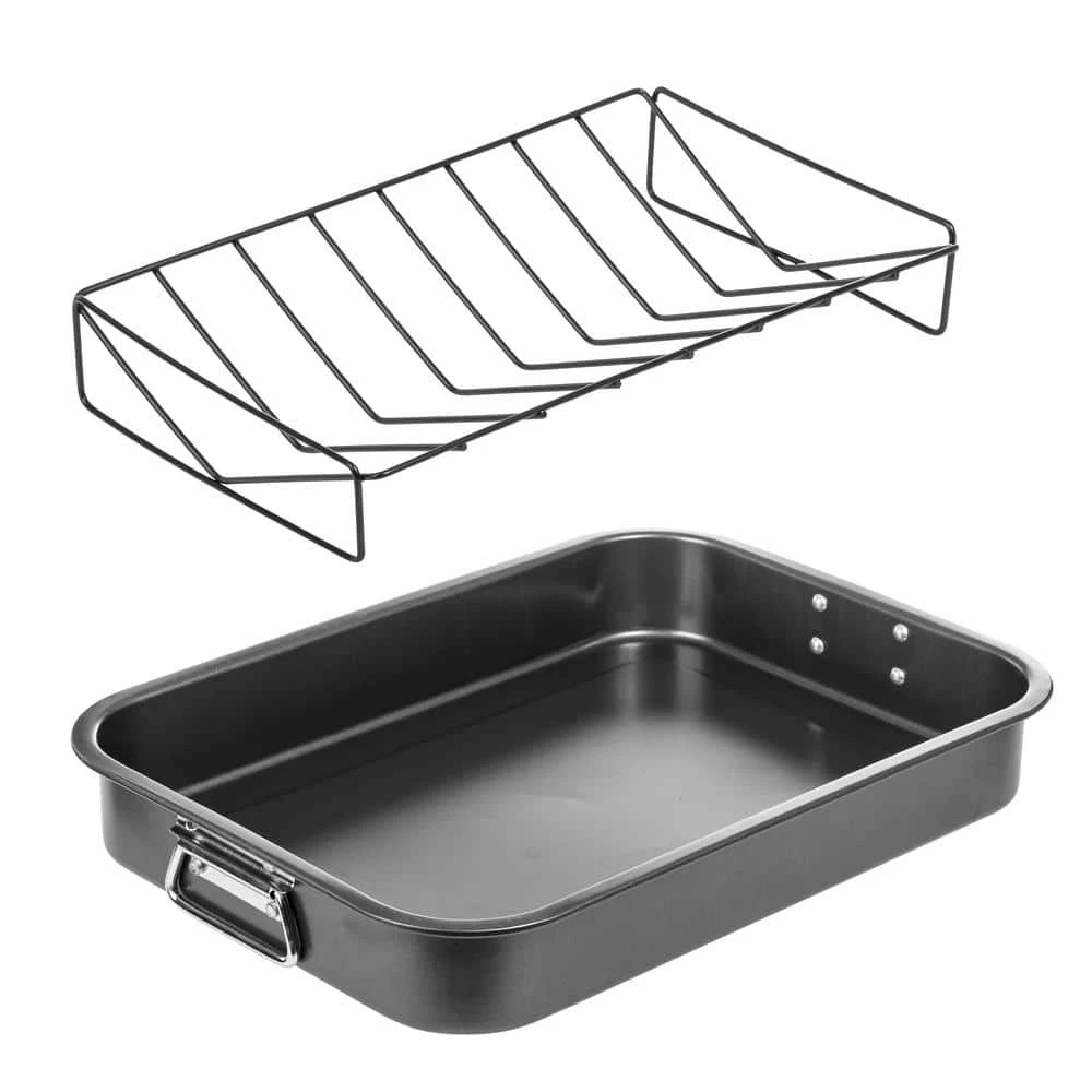 Roast your meat with this high quality end stainless steel baking pan, made from Carbon Steel and made durable for heavy-duty. It cooks evenly and beautifully with anything you roast. Perfect for baking brownies, lasagna and much more. It comes with a removable rack. It has heavy-duty riveted handles that can be folded down for easy storage. Easy to clean afterwards.