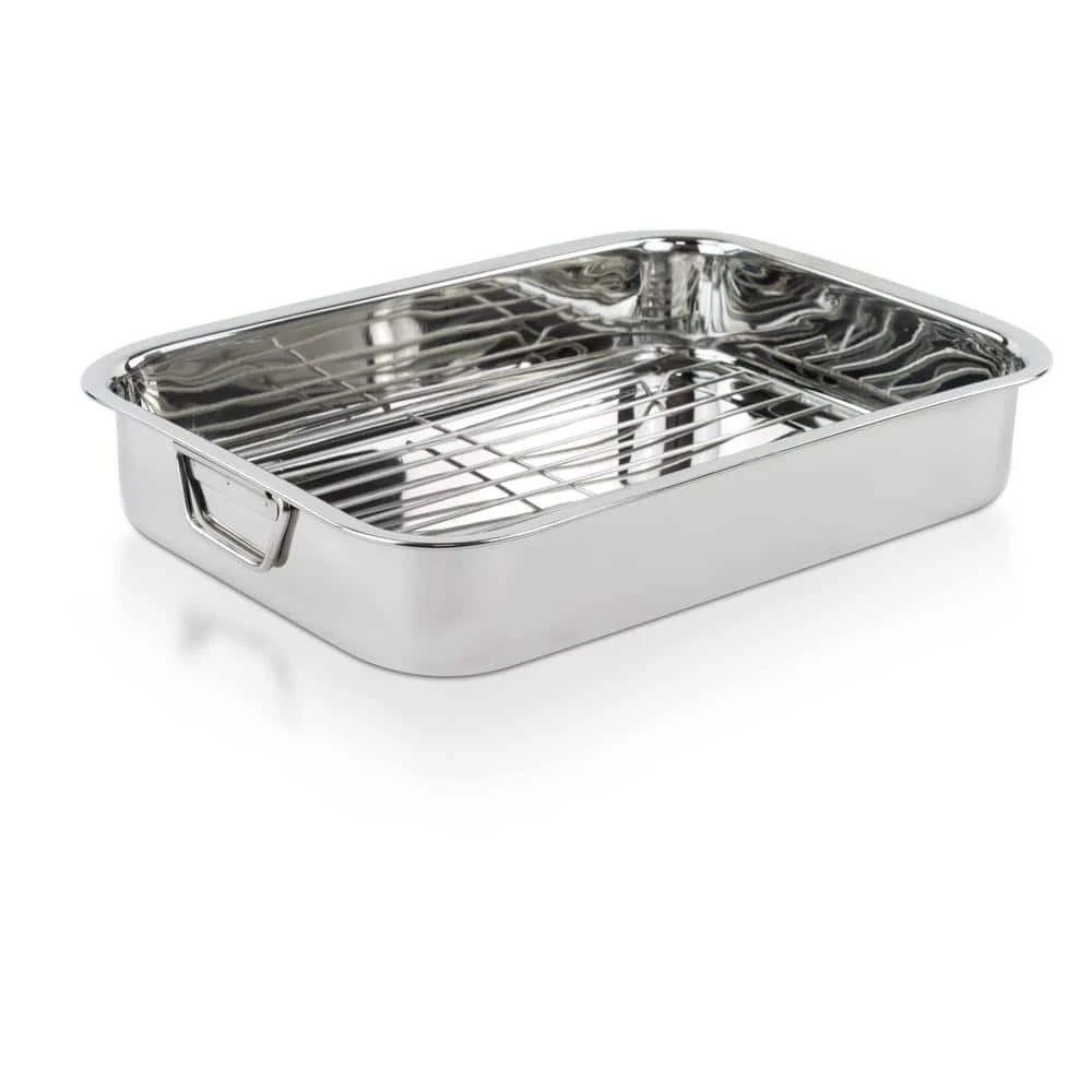 The heavy-duty and oven-safe baking tray and rack is the essential holiday cookware for your favorite dishes. Its high-quality stainless steel base and chrome-plated wire rack helps any food retain their juiciest and best form. The chrome-plated rack contains inward folds to hold itself upwards about 6 cm from the base to avoid any contact with unwanted residue. However, the removeable rack (13.5 x 9.13) can be removed for full use of the multi-purpose pan (16 x 12). The sturdy riveted handles help move the stainless steel pan with ease and no accidents which are perfect for cooks in the family or friend circle. Embrace your cooking skills and bake your best lasagna, chicken, turkey, meatloaf, pizza, chicken or other favorites with no stress.