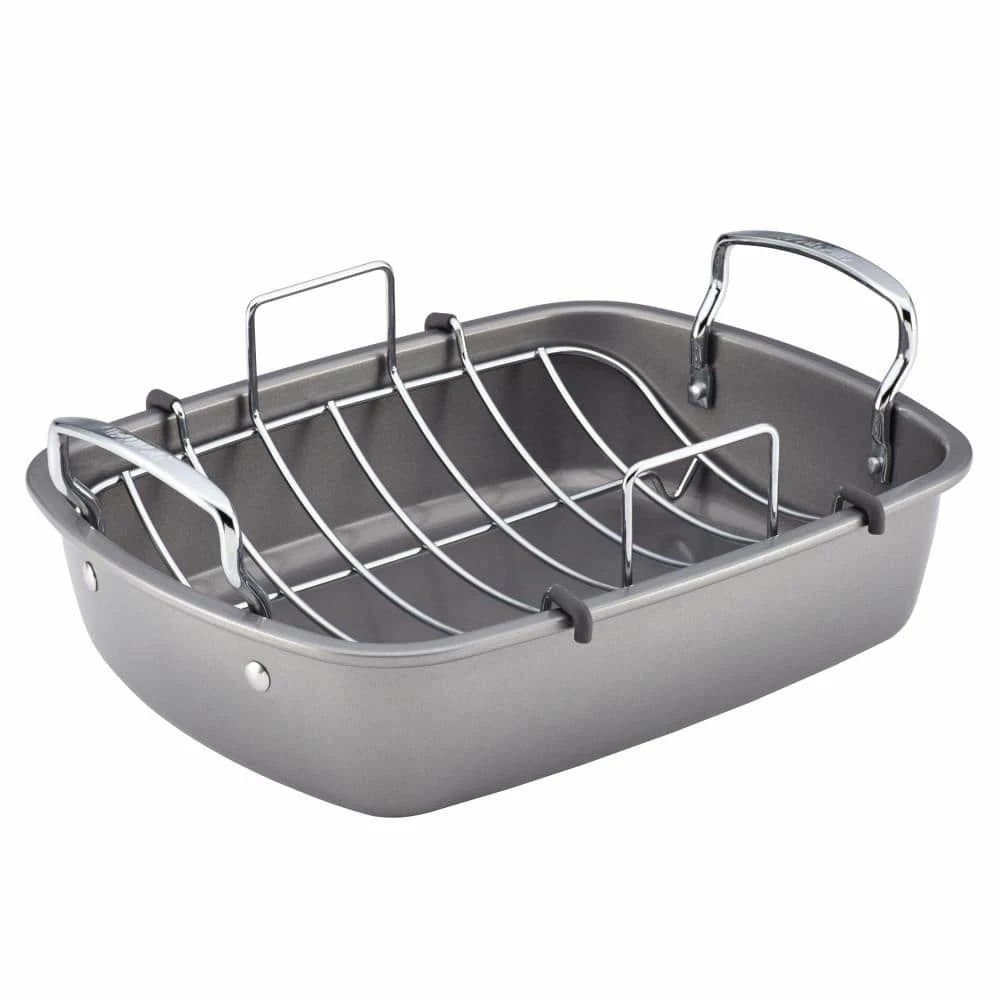 The Circulon Nonstick Bakeware 17 in. x 13 in. Roaster with U-Rack makes it simple to create healthy, lean and mouthwatering dishes, from a maple-and-cider-brined turkey to a pork loin roast with cranberry chorizo stuffing. With its convenient chrome-plated U-shaped rack, this roaster keeps meats off the bottom of the pan so unwanted fats drip away to the bottom of the roaster. The heavy gauge steel construction promotes balanced heat distribution for superior cooking performance and long-lasting durability while the rolled edges provide extra strength. The roaster also features PFOA-free premium-quality nonstick for excellent food release and easy cleanup. Oven safe to 450°F, this well-proportioned roaster is a great way to create healthier, more delicious meals. Crafted with elegant contemporary design and ready to deliver even more healthy cooking solutions, the roaster coordinates well with many other items in the Circulon Bakeware collection.