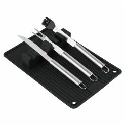 Purposely designed for BBQ and grill chefs, the Ozeri BBQ and Grill Utensil Holder Mat protects BBQ countertops from spills and hot utensils, while at the same time providing a convenient holder for utensils and anything needed right next to the grill action. Durably made, the Ozeri Utensil Holder Mat includes 4 slots for the most commonly used BBQ utensils. These slots ensure your BBQ utensils stay elevated and free of cross contamination, while protecting the countertops from stains and damage. The Ozeri Utensil Holder Mat also features a raised lip around the edges to prevent drips and hot oils from spilling Over onto countertops. Made of food-grade, heat-resistant, non-slip silicone, the BPA-free and odor-free Ozeri Utensil Holder Mat cleans easily after grilling and is dishwasher-safe. For easy storage, the Utensil Holder Mat can be rolled or is easily hung from the convenient corner holes. Mat measures 18.1″ x 12.1″. Note, this product is not a grill mat. Do not place directly on the grill. Utensils shown in photos are for visualization only, and are not included.