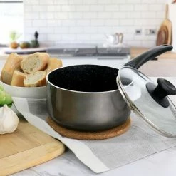 This 2.5 qt. nonstick aluminum saucepan by Oster is the perfect addition to your home cookware. Constructed with durable and long lasting aluminum base with a tempered glass lid. Features Bakelite handles and knob that stay cool while you are cooking for convenient transportation. Lid features a venting hole that releases steam while you cook. Nonstick interior coating for low-fat cooking and easy clean up.