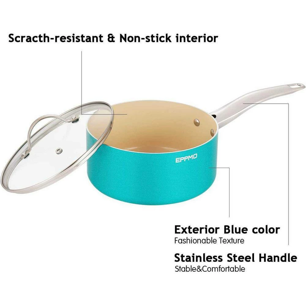 EPPMO Ceramic Nonstick and Healthy Non-toxic Sauce Pan have a durable and innovative Triple-Ply construction with a long lasting Nonstick Ceramic Coating for easy cleaning and less oil cooking. It’s premium quality aluminum core allows quick and even heat distribution, which makes cooking easier and more effective. At the same time, it is super easy to clean up by handwash or dishwasher, with oven safe up to 500° F (with glass lid up to: 300 ℉).