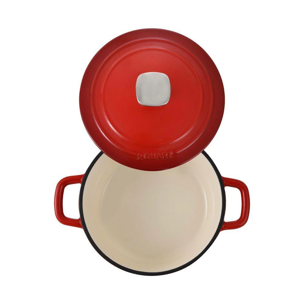 The 2-quart enamel cast iron Dutch oven from MasterPRO combines elegance and performance in a perfectly compact vessel. This enamel Dutch oven features a capacity ideal for soups, sides, sauces, or baked goods. The durable light-colored enamel interior is easy to clean and allows for easy monitoring of the cooking process. The self-basting lid locks in flavor and moisture as the vessel perfectly retains heat. With an attractive ombre colored exterior, the 2-quart enamel cast iron Dutch oven seamlessly goes from the kitchen to serving on the table.