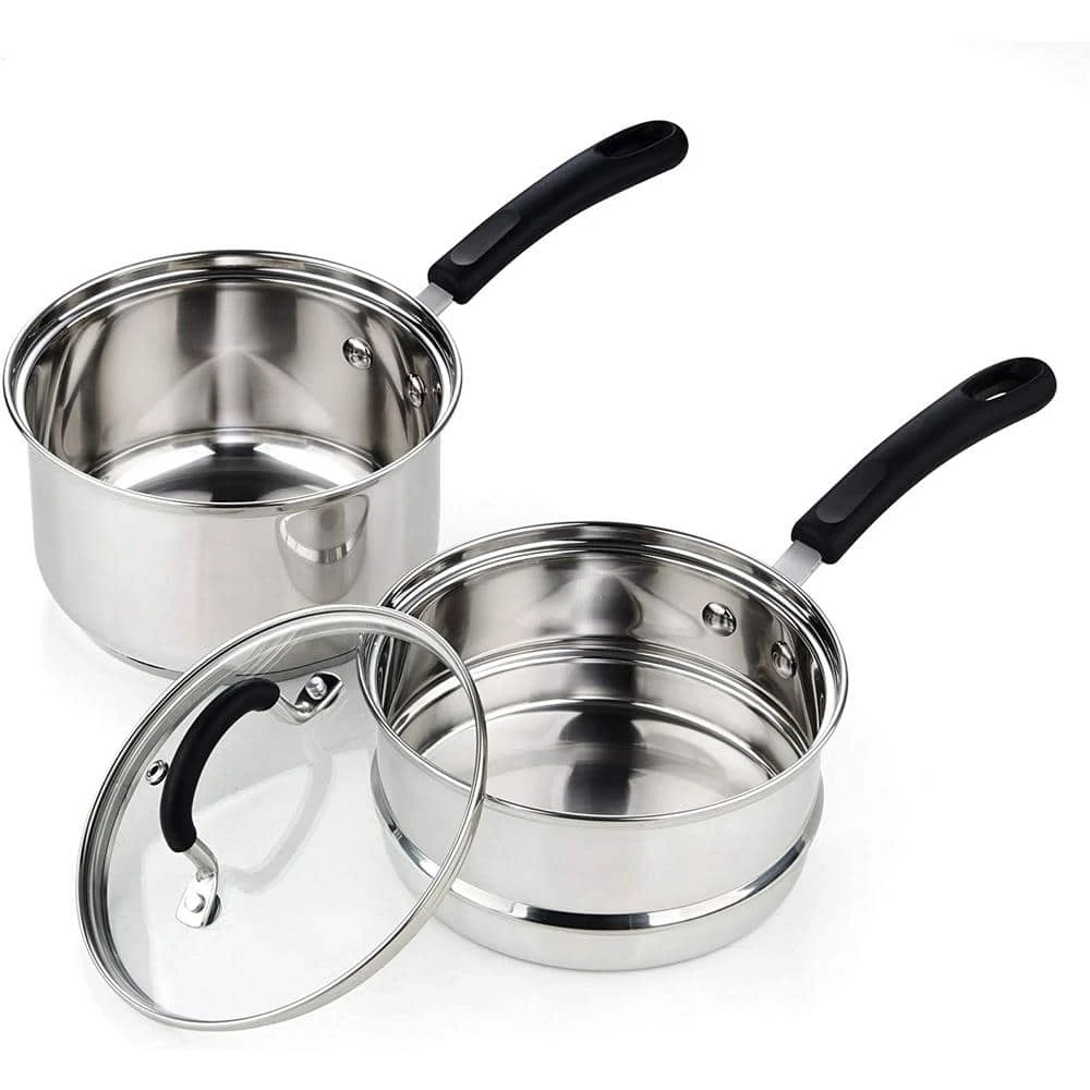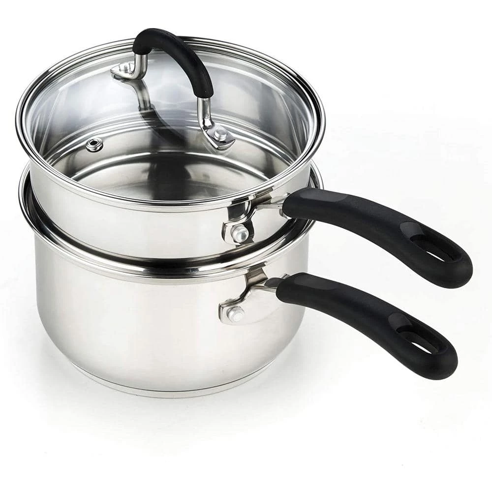 The Cook N Home stainless steel double boiler with lid is made of polished 18-10 stainless steel with an aluminum disc layered in the bottom. Stainless steel for durability, easy cleaning, and appearance. The aluminum disc provides even/quick heat distribution and prevents hot spots. Tempered glass lid with steam vent makes viewing food easy from start to finish. Silicone wrapped handle for a cool and comfortable grip. The handle is riveted for strength for carrying. Induction compatible. Works on: gas, electric, glass, ceramic, halogen, etc. Not oven safe. Dishwasher safe, hand wash recommended.