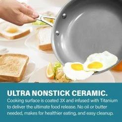 - Ultra-nonstick – nonstick cooking surface is coated 3-times and reinforced with diamonds to deliver ultimate food release, no oil or butter needed makes for healthier eating and provides for hassle free, 1-2-3 cleanup