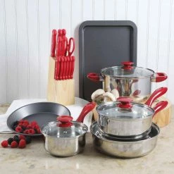 - Includes: 1 dutch oven with lid, 1 2.1 qt. saucepan with lid, 1 1 qt. sauce pan with lid, 1-frying pan, 1-chef knife, 1-bread knife, 1-boning knife, 1-utility knife, 1-paring knife, 1-pair of kitchen scissors, 6-steak knives, 1-knife wood block, 1-cookie sheet, 1-pie pan