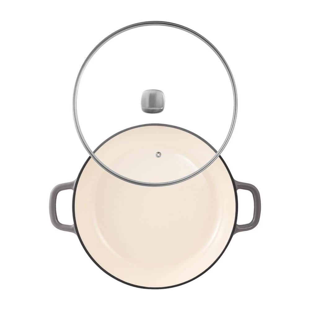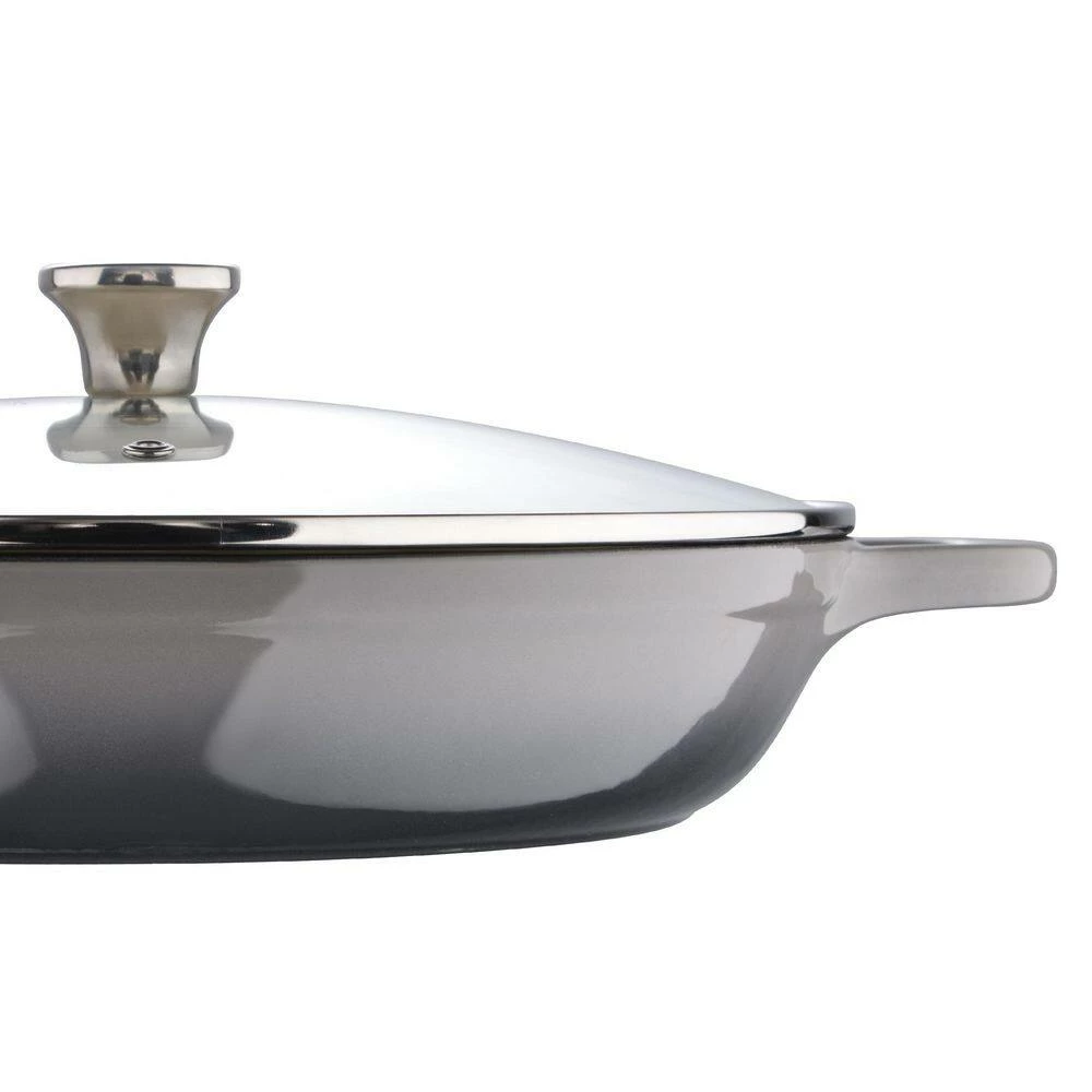 The enamel cast iron braiser from MasterPRO has been designed to meet the culinary goals of every cook. This versatile pan can braise ribs, roast poultry, slow-cook gravies, fry chicken, bake dessert, and everything in between. The transparent glass lid and light-colored enameled interior allows for easy monitoring of the cooking process, so your results are always perfect. Cook up a storm in the kitchen then take the braiser to the table for a beautiful meal presentation.