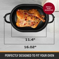 - CAPACITY – the dimensions of the pan measures 16″ from the exterior and 11.4″ from the interior. Designed to fit in all standard sized ovens. The pan can accommodate up to a 7-pound poultry or roast and is ideal for serving between 1 and 5 guests.
