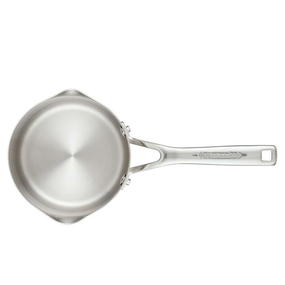 Experiment with and discover new flavors and techniques when cooking with the KitchenAid 3-Ply Base Stainless Steel Saucepan, designed with an extra thick layer of heat-conducting aluminum to eliminate hot spots by distributing heat evenly from edge to edge. Heavy-gauge stainless steel pan features a heavy bottom base for lasting durability, and has etched measuring marks to explore and test ingredients for new recipes. Pour spouts allow for precision pouring of rich, homemade bechamel sauce and savory au jus. Curious cooks can investigate a wider range of recipes in the broiler and oven, where cookware is safe to 500°F.