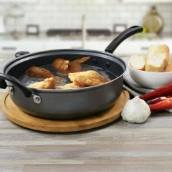 This Highberry chicken fryer by Gibson Everyday is perfect for frying meats or cooking large portions. The wide base and 3in height gives you some extra splash guard when frying, and plenty of base cooking area for preparing whole one-pot meals. Nonstick interior coating makes cleaning up easy and prevents extra food particles from sticking. Bakelite handle stays cool while you cook for easy mobility while the pan is still hot. This pan comes with a vented tempered glass lid so you can monitor your cooking progress as you go. Hand wash only.