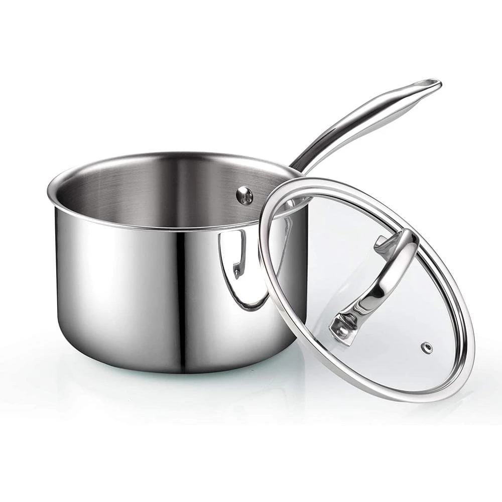 The Cook N Home 02680 Tri-Ply Clad Stainless Steel Sauce Pan with Lid 3 qt. sauce pan comes with a tempered glass lid with steam vent to view food and keep heat/moisture in and a riveted handle for strength. The Tri-ply Clad metal construction is made of 18/10 stainless steel with an aluminum core creating a permanent bond of metal allowing heat to pass through the whole pan-along the bottom and up. This pan works on all stove tops.