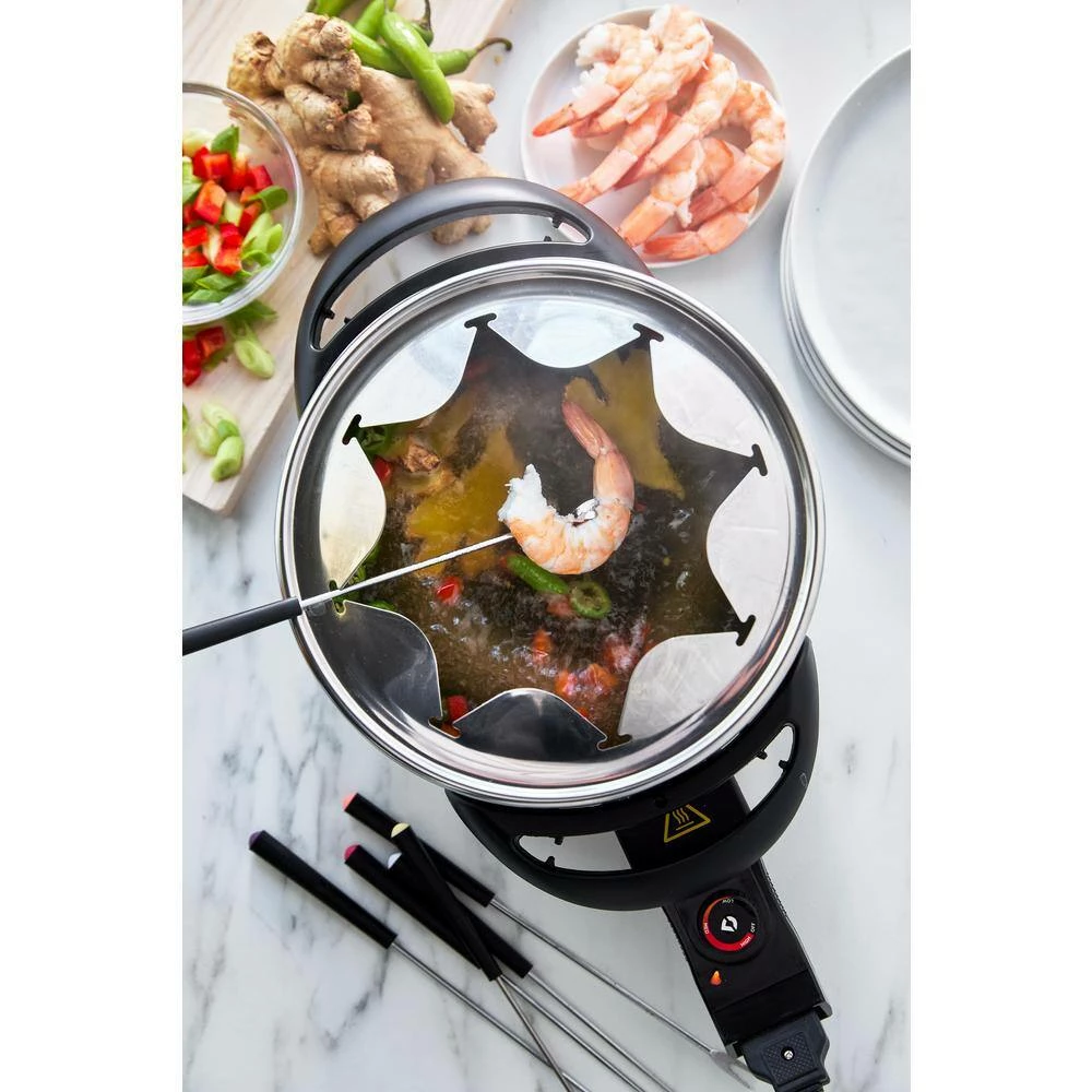 Fondue it together. The Fondue Party makes it easy for people to get together and celebrate flavor. Everyone can gather to dunk a savory meat or a sweet dessert and create a delicious taste to define the night. The 3 qt. capacity means you have plenty of food for everyone. Fondue Party features our signature healthy ceramic nonstick coating to makes cleaning up after the party effortless. With low, medium, and high settings, it’s easy to find the right flavor for your meal. The 8-color coded tips on each fork make it simple for your guests to have their own.