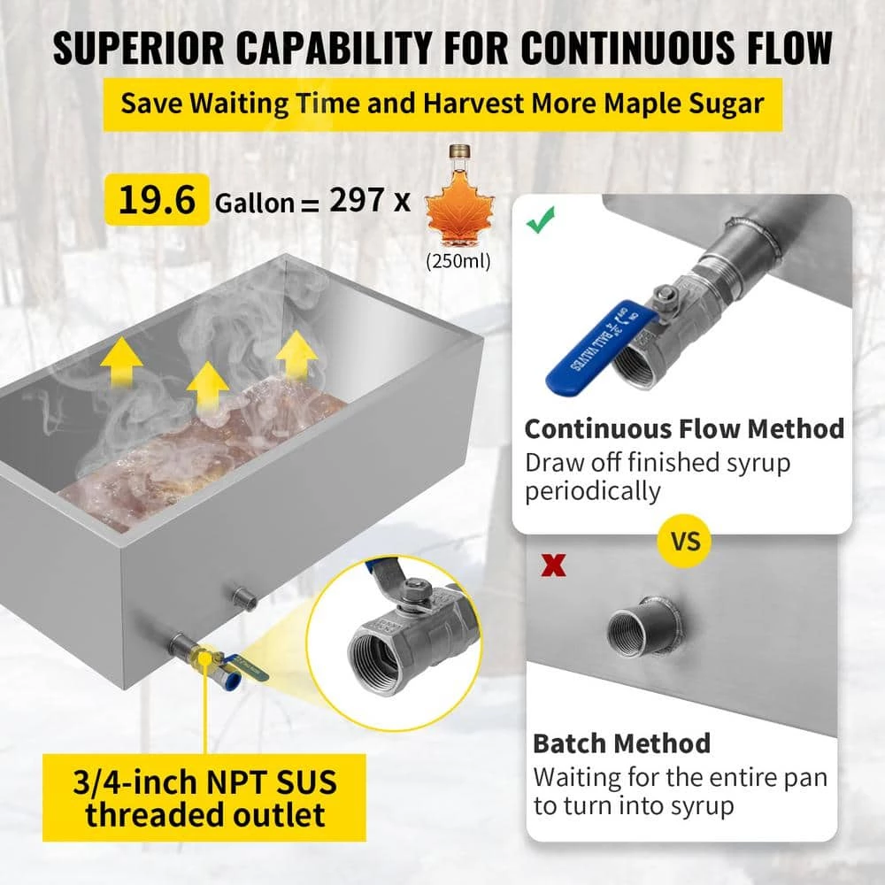 - Efficient Processing Flow: Handle nearly 19.6 gal. of sap in total, meaning 297 bottles of 0.07 gal. maple syrup can be made. The maple syrup pan comes with a 3/4 in. valve to adjust the flow rate and load the maple syrup into other containers