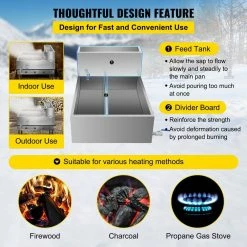 - Considerate Design: The addition of a feed tank and a divider board plays an important role. The feed tank can preheat part of the sap; the divider board can reinforce the strength to avoid deformation after burning for too long. This syrup pan is suitable for outdoor or indoor use and supports many heating fuels: firewood, charcoal, propane gas stove, etc