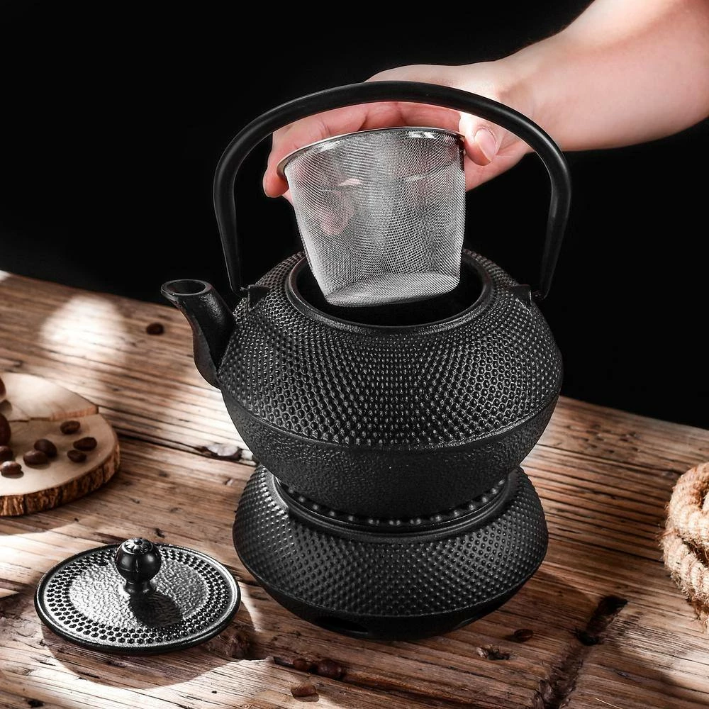 - Package includes: 1-cast iron tea kettle, 1-stainless steel, infuser 1-teapot warmer