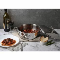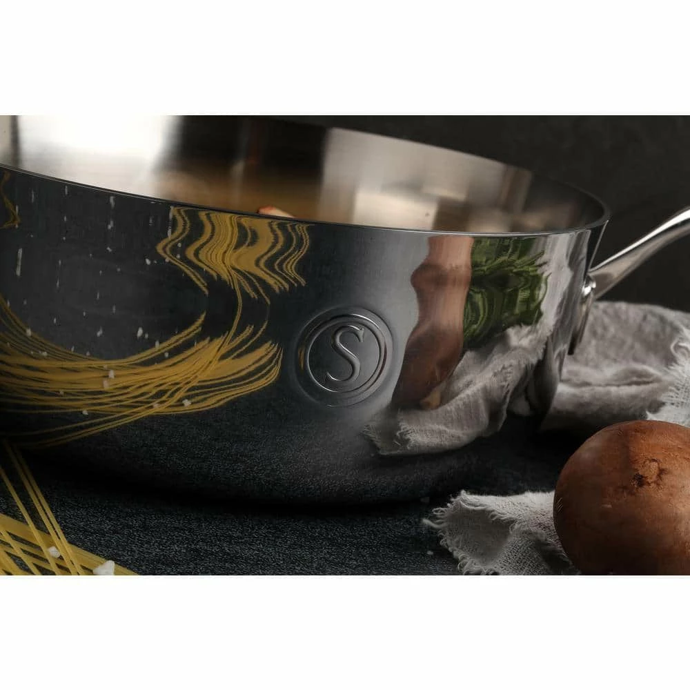 - Tri-ply stainless steel construction with an aluminum core for fast and even heat distribution
