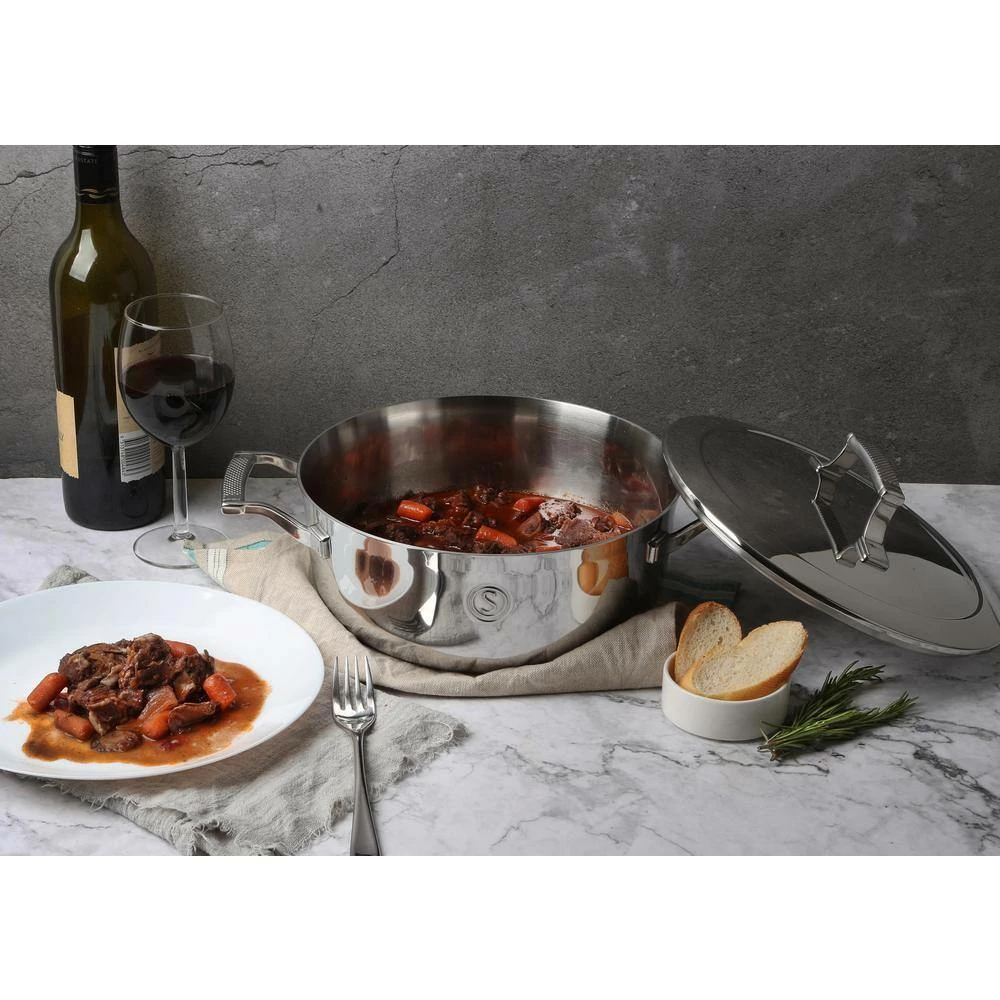 The SAVEUR SELECTS Voyage Cookware Collection brings affordable and stylish performance cookware to culinary explorers who love the art of cooking. The collection has been designed with multiple features to enhance the cooking experience from kitchen to table. Our cookware features Tri-Ply stainless steel construction, double walled lids with internal drip rings and signature stay-cool, non-slip handles.