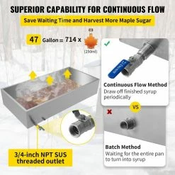 - Efficient Processing Flow: Handle nearly 47 gal. of sap in total, meaning 714 bottles of 0.07 gal. maple syrup can be made. The maple syrup pan comes with a 3/4 in. valve to adjust the flow rate and load the maple syrup into other containers