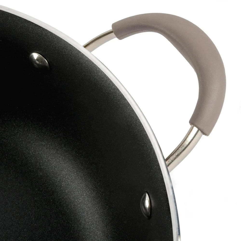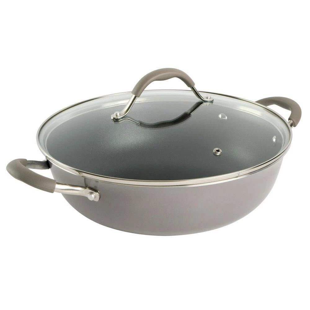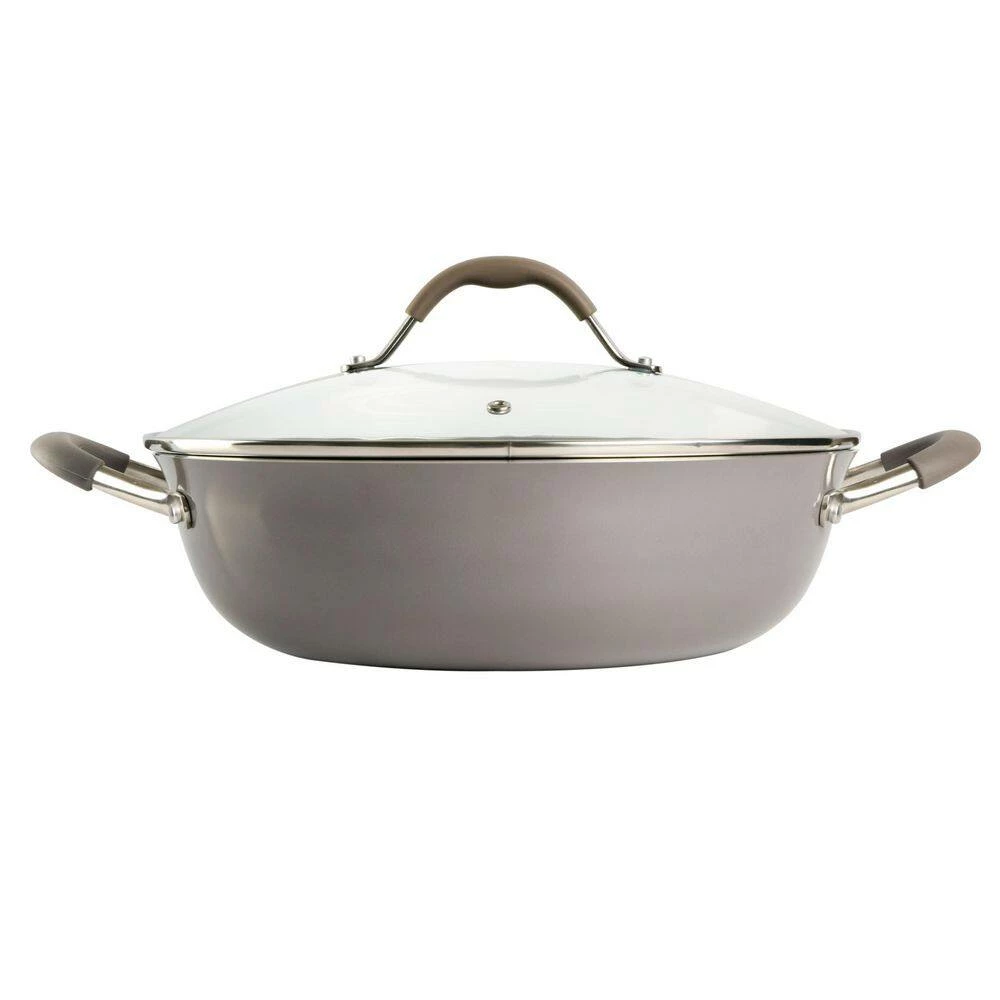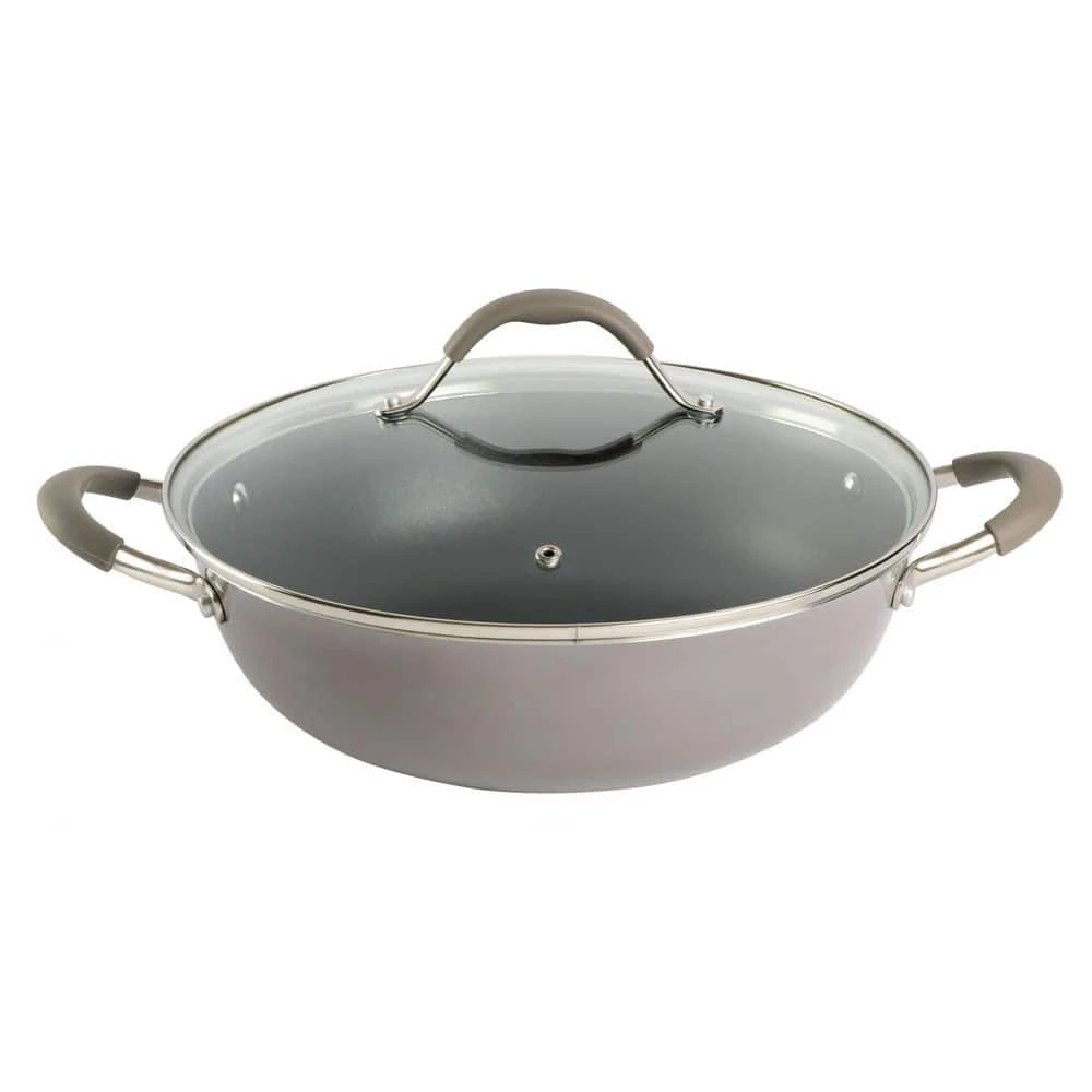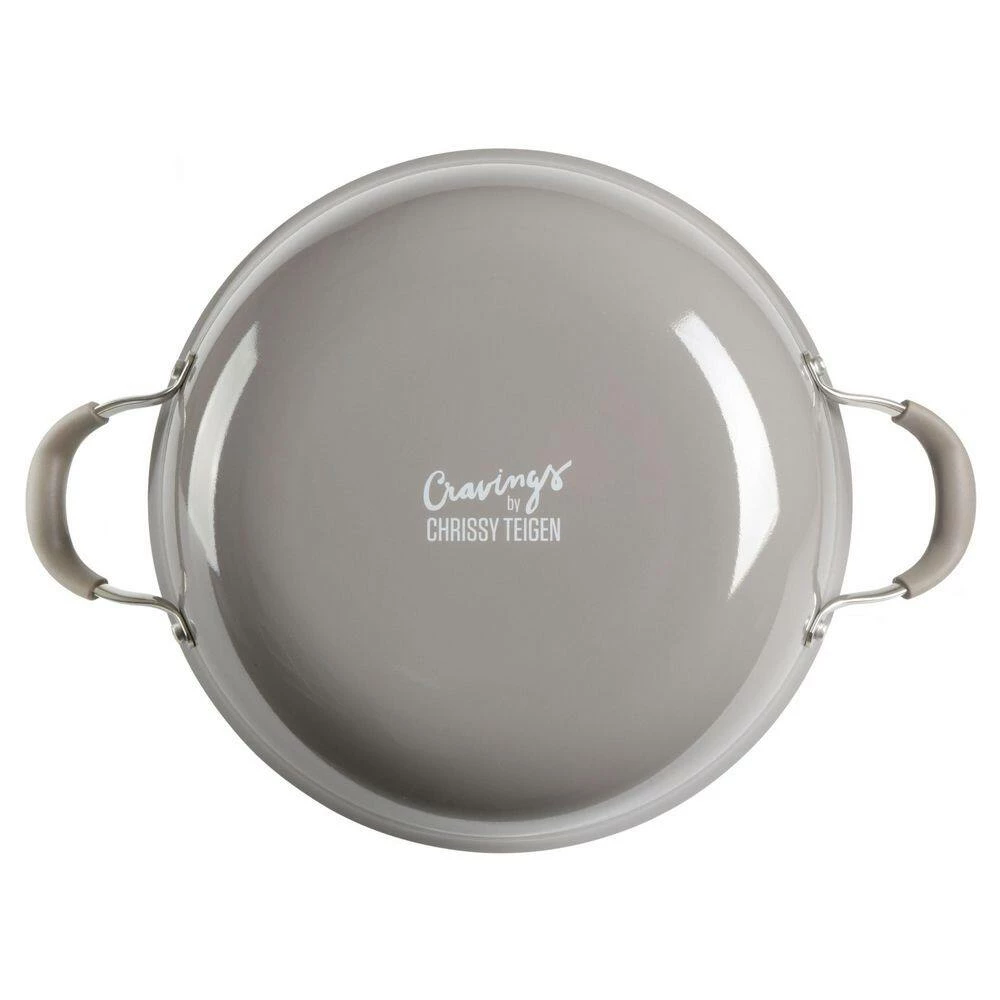 Cook to your heart’s content with the Cravings By Chrissy Teigen 5 Quart Enameled Aluminum Everyday Pan in Shadow with Silicone Handles. Perfect for cooking a variety of dishes, it’s aluminum body distributes heat evenly for uniform cooking. This Saute pan is compatible with any gas, ceramic, and electric heat sources. The silicone handles allow for cool touch use even during high heat cooking.