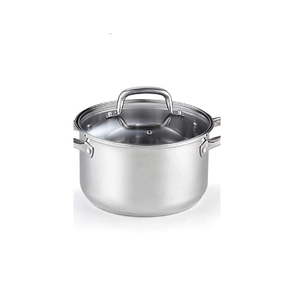 The Cook N Home 5- qt. Stainless Steel Casserole Stockpot with Lid is made of mirror polished 18/10 stainless steel with an aluminum disc bottom between steel layers. The aluminum disc capsuled bottom provides even/quick heat distribution and prevents hot spots. Reflective finish inside and out for appearance and easy cleaning.-flat base and lightweight for storage and sits evenly on cooktops. Tempered glass lid with steam vent makes viewing food easy and provides an inside seal. Riveted stainless steel handles are durable, comfortable, and wide/deep for grip. Handles stay cool and have a hole for hanging. Multipurpose and holds temperature for boiling, frying, steaming, and more. Induction compatible. Works on: gas, electric, glass, ceramic, halogen, etc. Oven safe to 500F, glass lids to 350F. Dishwasher safe.