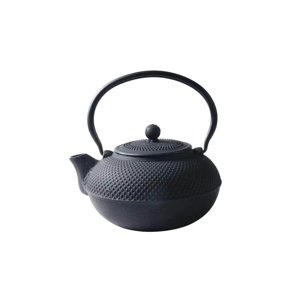 Cast Iron Teapot in a matte Black finish. A graceful, elegant cast iron Tetsubin teapot, inspired by highly prized antique Japanese cast iron teapots still in use today. Features a black porcelain enamel interior coating that helps prevent rust. Includes a stainless steel tea brewing basket for ease of preparation. For brewing and serving tea; not intended for stovetop use. 52 oz. capacity. Hand Wash.
